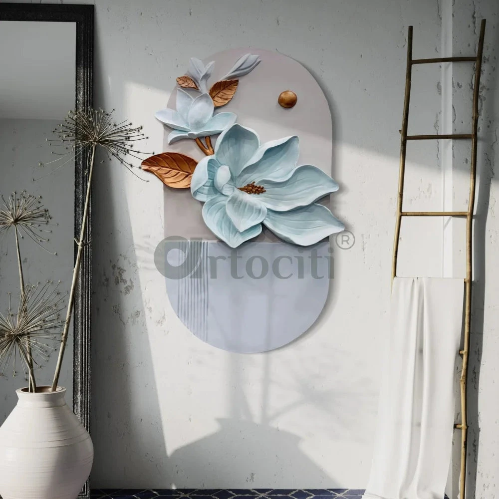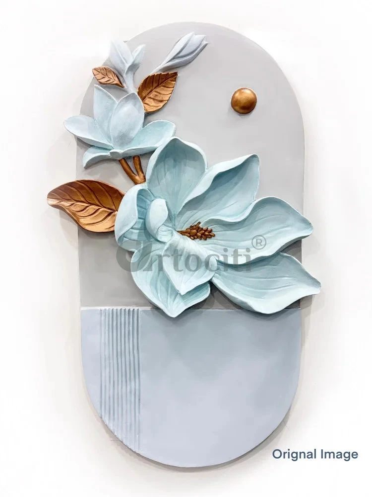 Elevate your living space with this stunning Floral Relief Mural Wall Art. Crafted with intricate 3D flower details, this multi-colored piece brings a sense of elegance and nature indoors. The soft blue petals, complemented by copper-toned leaves, create a visually appealing contrast, perfect for any modern or minimalist home décor.