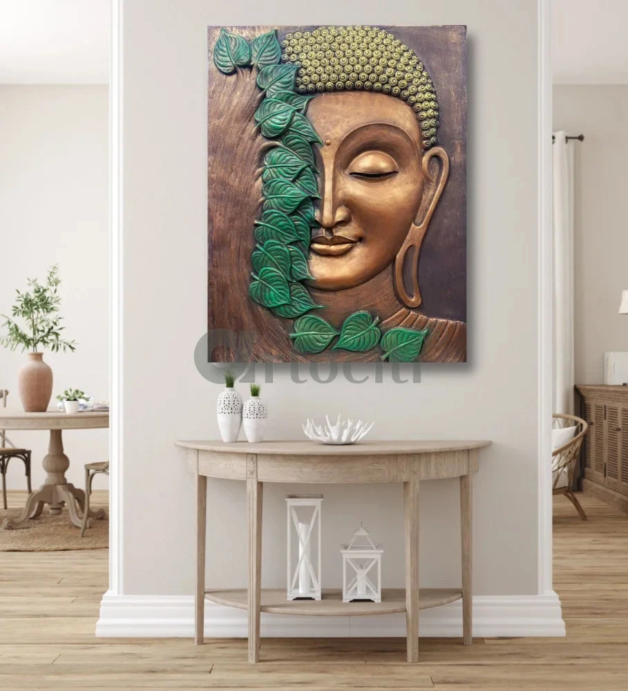 Our breathtaking Meditating Buddha Face 3D mural, a perfect choice for creating an elevated and serene ambiance. Crafted in fiberglass, this masterpiece showcases the tranquil face of a meditating Buddha in exquisite detail. Available in a combination of golden bronze and green colors, this mural captures the essence of spirituality and harmony. The golden bronze color exudes warmth and elegance, while the touch of green adds a refreshing and calming element. The relief technique used in crafting this mural brings depth and dimension to the Buddha’s serene visage, creating a captivating focal point. Made with high-quality fiberglass, this mural is not only visually stunning but also durable and long-lasting. Whether it’s a meditation space, a yoga studio, or a peaceful corner in your home, this Meditating Buddha Face 3D mural will elevate the atmosphere, inspiring serenity, inner peace, and mindfulness. Choose our Meditating Buddha Face 3D mural to transform any space into a haven of tranquility and enlightenment.