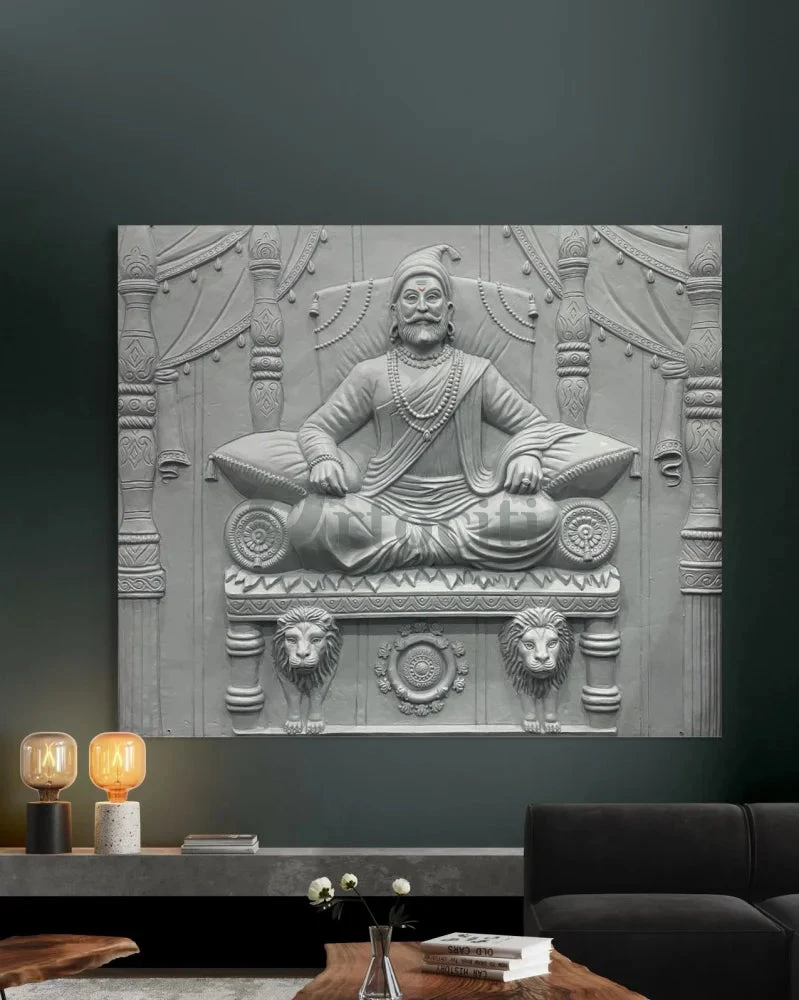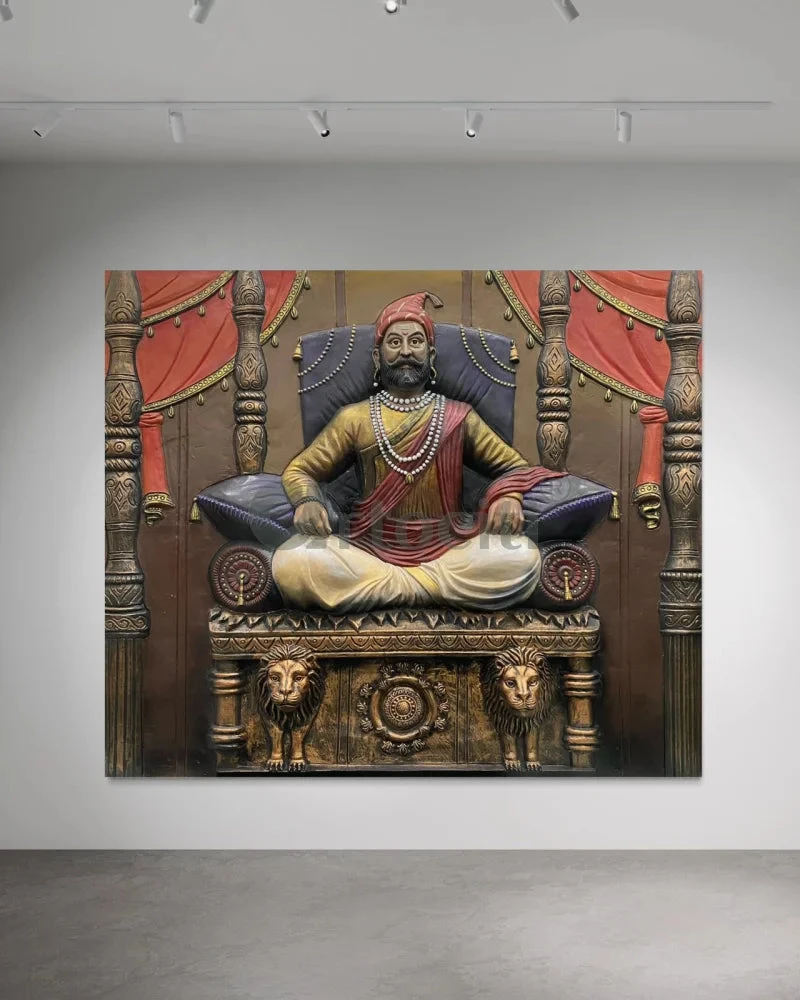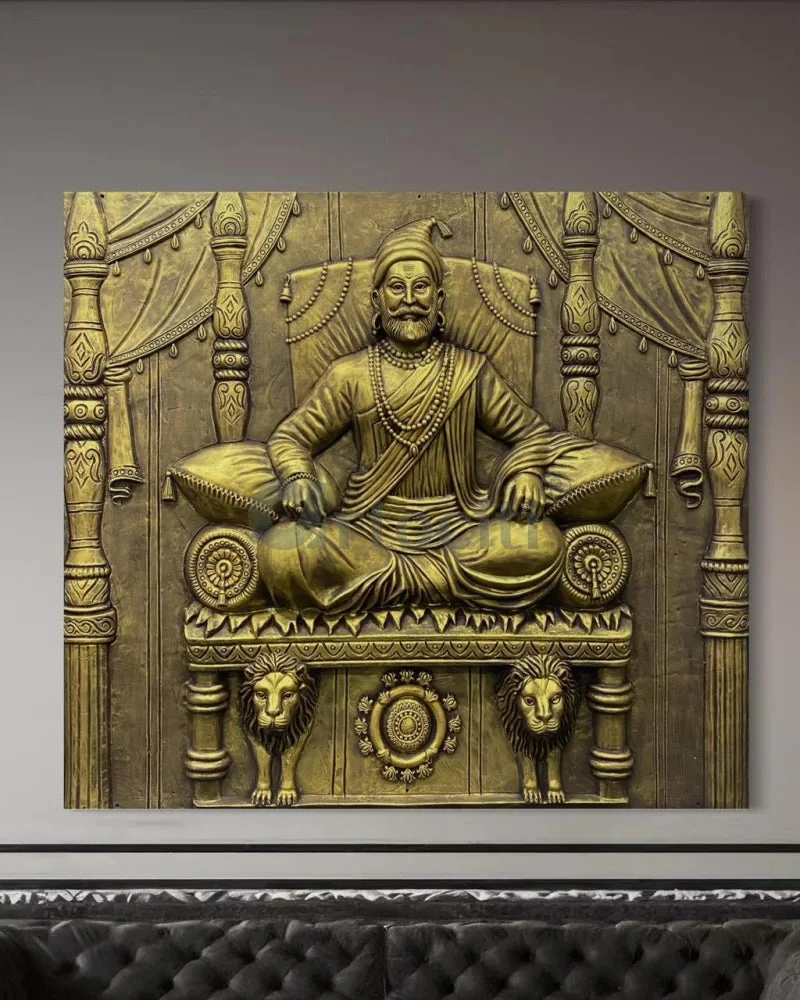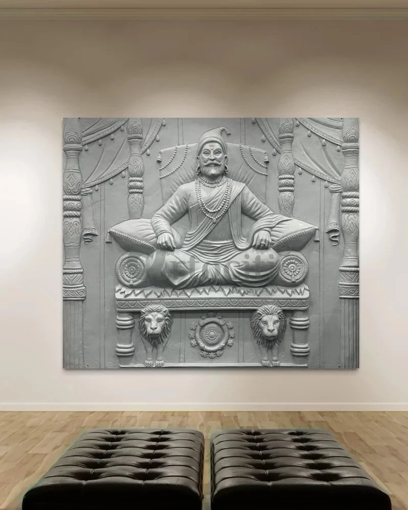 Bring history and elegance into your space with this stunning 3D relief mural of Chhatrapati Shivaji Maharaj, meticulously designed to capture the valiant spirit and grandeur of the Maratha king. Crafted with high precision, this masterpiece highlights Shivaji Maharaj seated royally on a lion-adorned throne, surrounded by intricate carvings of ornate pillars and traditional motifs that evoke a sense of regal artistry.