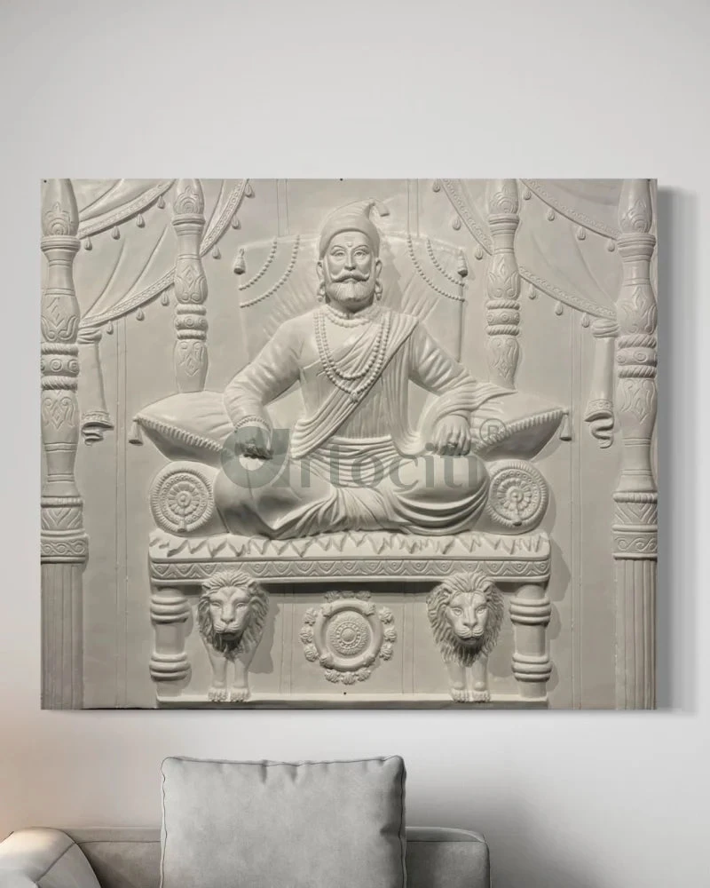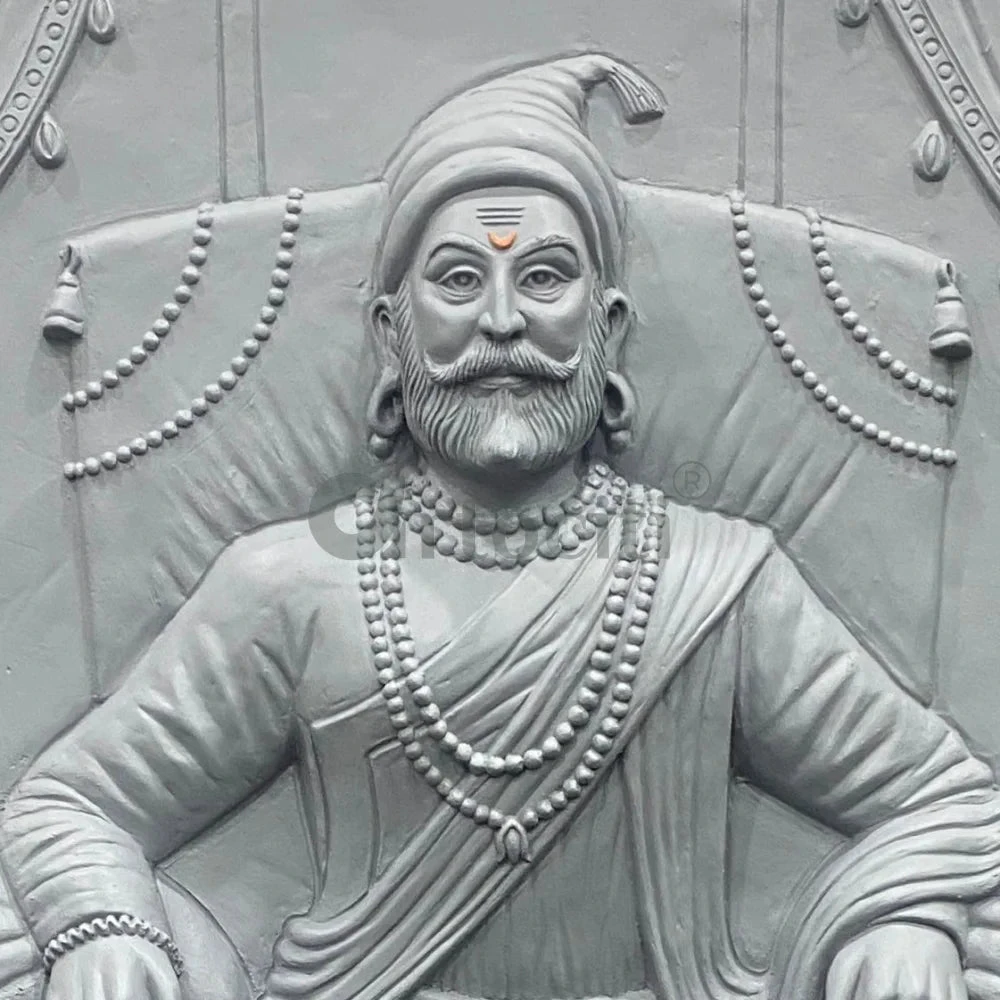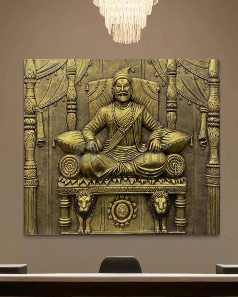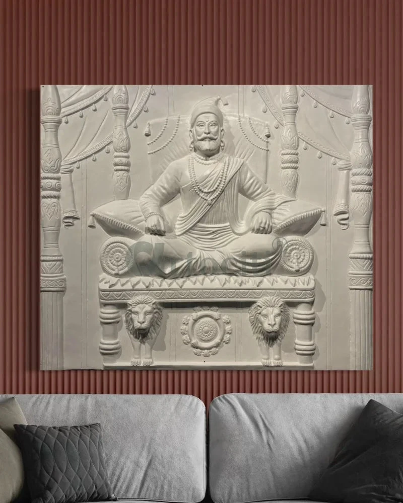 Bring history and elegance into your space with this stunning 3D relief mural of Chhatrapati Shivaji Maharaj, meticulously designed to capture the valiant spirit and grandeur of the Maratha king. Crafted with high precision, this masterpiece highlights Shivaji Maharaj seated royally on a lion-adorned throne, surrounded by intricate carvings of ornate pillars and traditional motifs that evoke a sense of regal artistry.