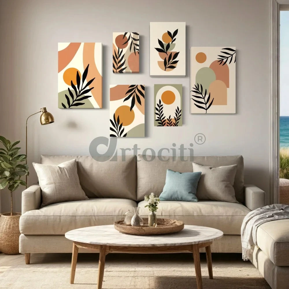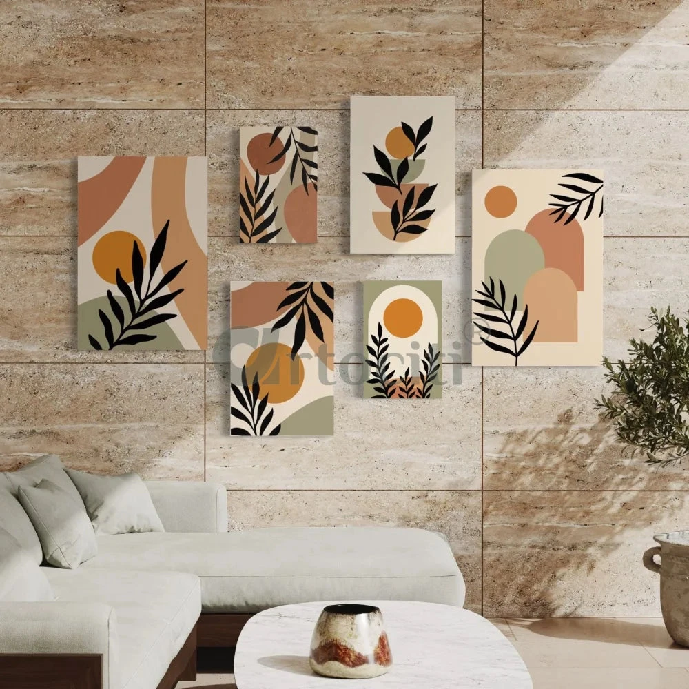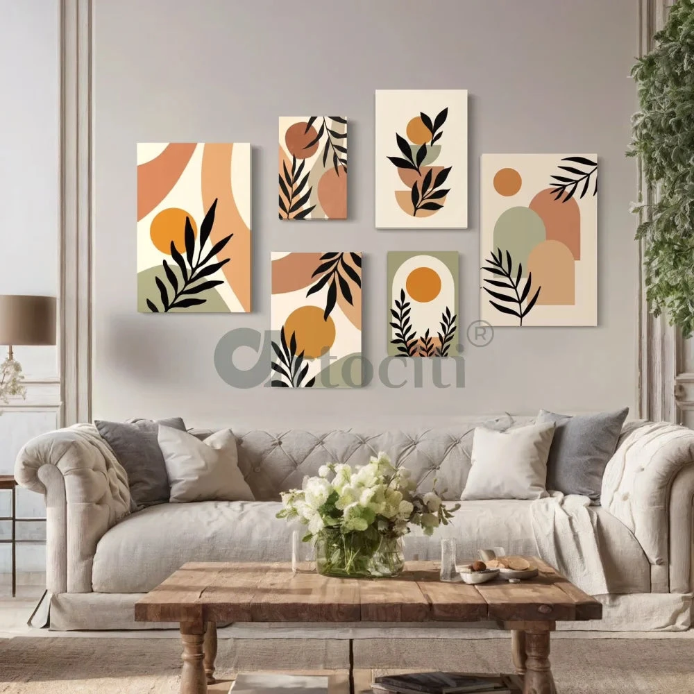Transform your living space with our exclusive set of 6 abstract boho design canvases, perfect for creating a stunning collage. This collection features two canvases each in sizes 30×20 inches (76.2×50.8 cm), 24×16 inches (61×40.6 cm), and 18×12 inches (45.7×30.5 cm). Printed on 380 GSM polycotton canvas, known for its superior durability and texture, these artworks are crafted using state-of-the-art Canon printers. The vibrant colors and intricate abstract patterns bring a touch of bohemian elegance to any room, making it a versatile addition to your home decor.