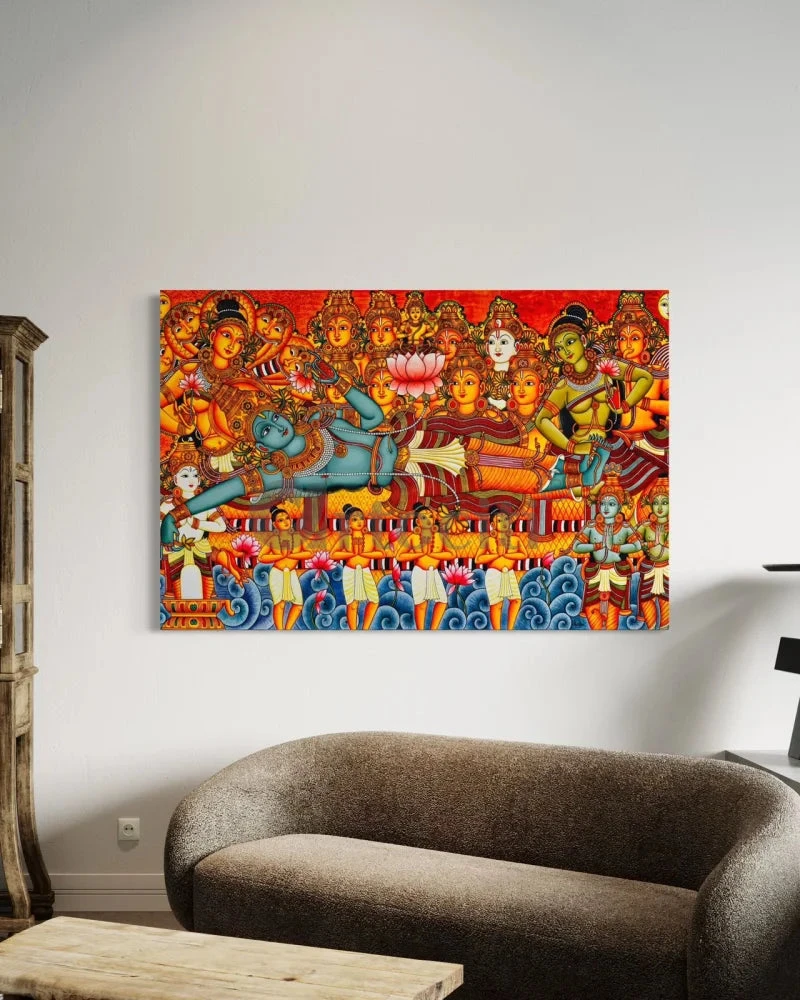 Elevate your space with the Ananthashayanam Kerala Mural Painting Canvas Giclee Print. This exquisite artwork captures the divine repose of Lord Vishnu, rendered in traditional Kerala mural style. Available in four sizes, from 12X18 Inches to 32X48 Inches, this high-quality 380 GSM print offers vibrant colors and intricate details. Perfect for enhancing your home or office, this piece brings a touch of spiritual elegance to any setting.