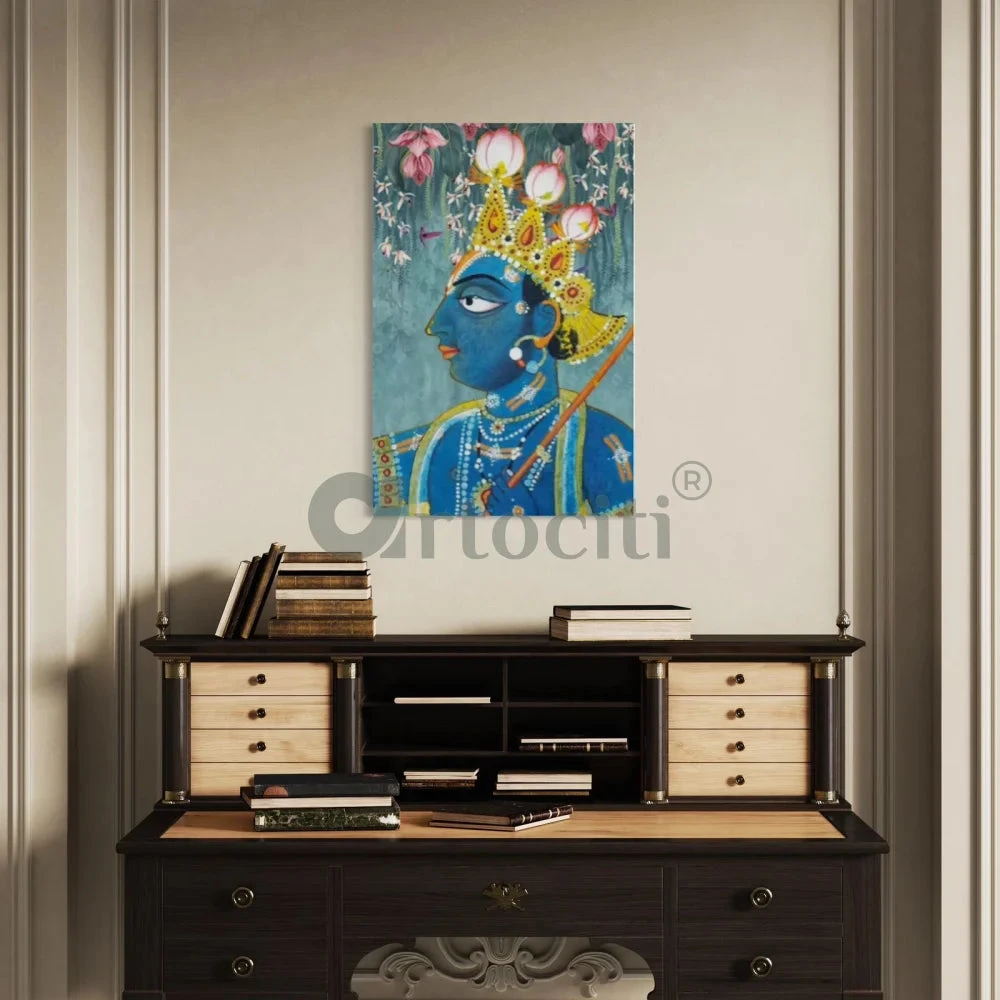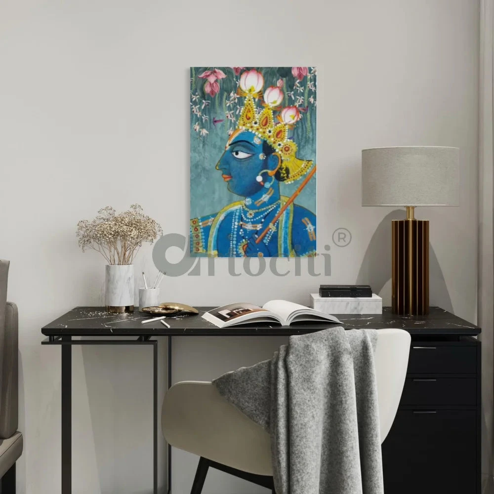 Immerse your space in divine charm with our Classic Traditional Blue Yellow Lord Shreenath Ji Pichwai Canvas Giclee Print. Capturing the essence of Krishna in traditional art, this masterpiece is available in sizes 24X16 inches and 30×20 inches. The vibrant color palette enhances the spiritual aura. Customize your experience with alternative color options—simply get in touch. Crafted on high-quality 380 GSM canvas, the print ensures durability and vivid detailing. Elevate your surroundings with the timeless beauty of Lord Shreenath Ji, radiating peace and tranquility.