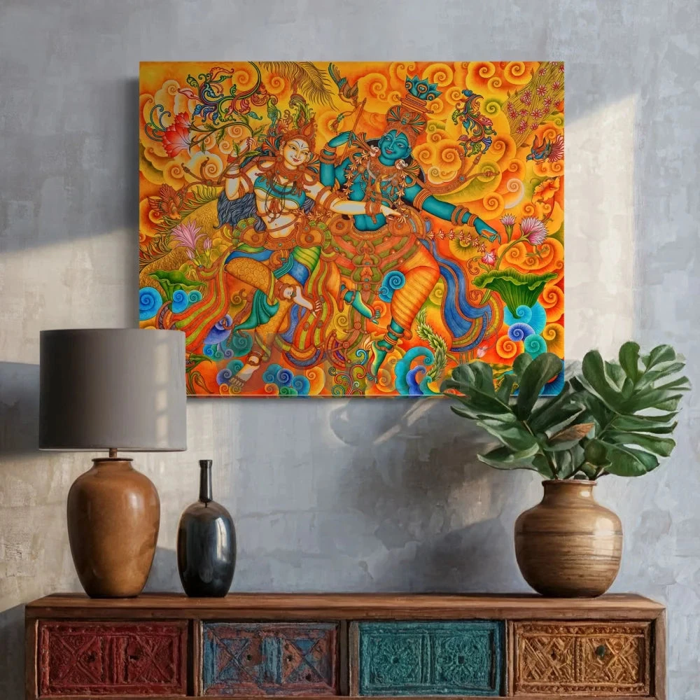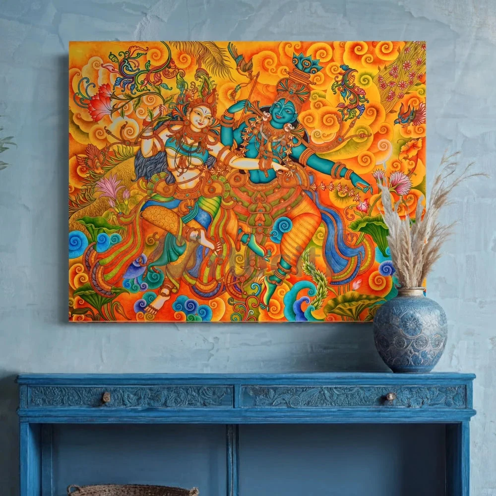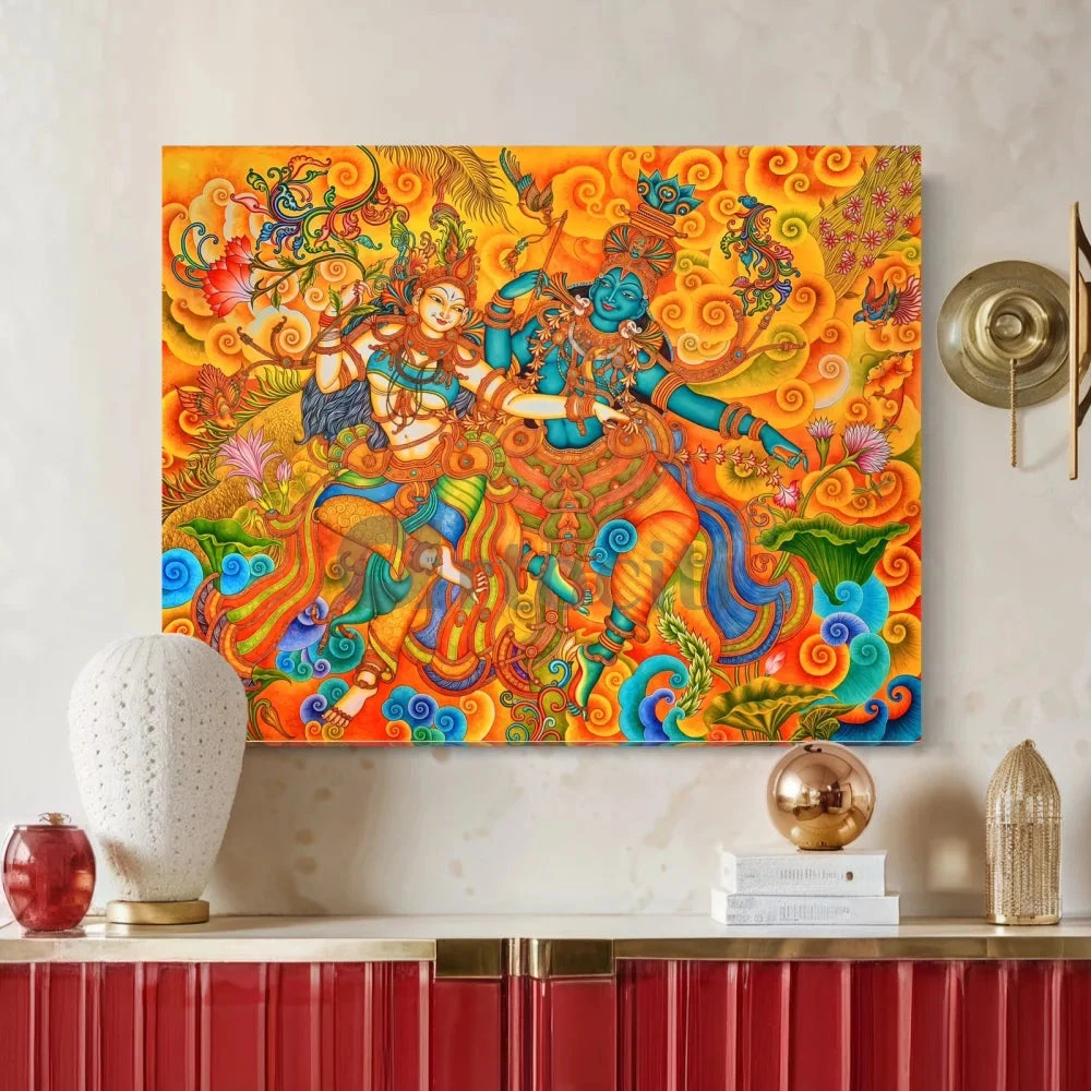 Experience the divine beauty and grace of our Dancing Radha Krishna Kerala Mural Canvas Painting. This exquisite artwork captures the timeless dance of Radha and Krishna, bringing a sense of spirituality and elegance into your home. Available in two sizes: 22×28 inches (55.88×71.12 cm) and 32×41 inches (81.28×104.14 cm), this painting is perfect for adding a touch of Indian tradition to any space.