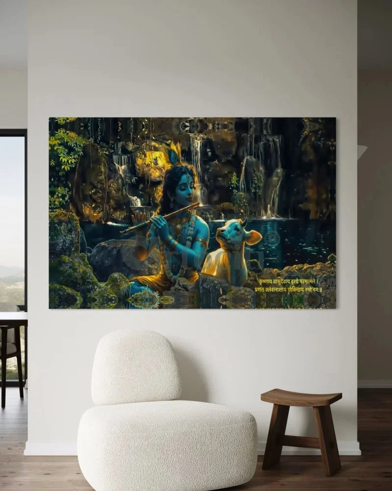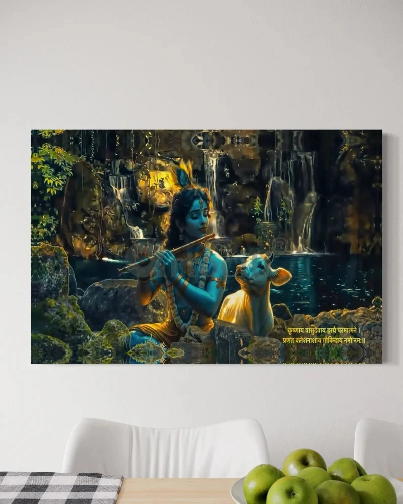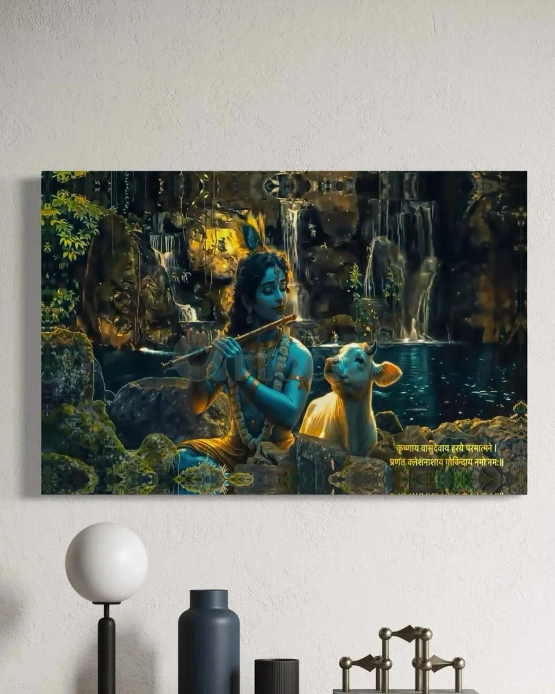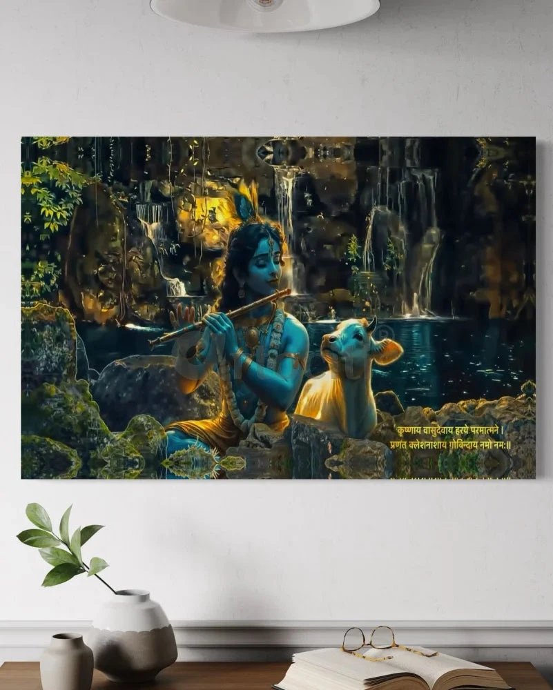 Immerse your space in divine serenity with this captivating Krishna with Cow by Waterfall Canvas Painting, a stunning representation of Lord Krishna playing his flute beside a calm cow, set against a magical forest and cascading waterfall backdrop. The vibrant blue tones of Krishna and the lifelike detailing of nature evoke a profound spiritual ambiance, ideal for prayer rooms, living spaces, or meditation corners.
