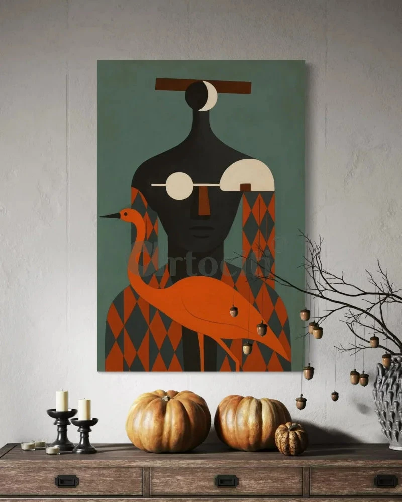 Elevate your interiors with this striking Abstract Tribal Canvas Painting, a modern fusion of geometry, symbolism, and bold earthy tones. The artwork features a stylized human figure with abstract details — including a lunar motif, geometric diamond patterns, and a graceful bird — creating a sense of mystery, balance, and cultural depth.