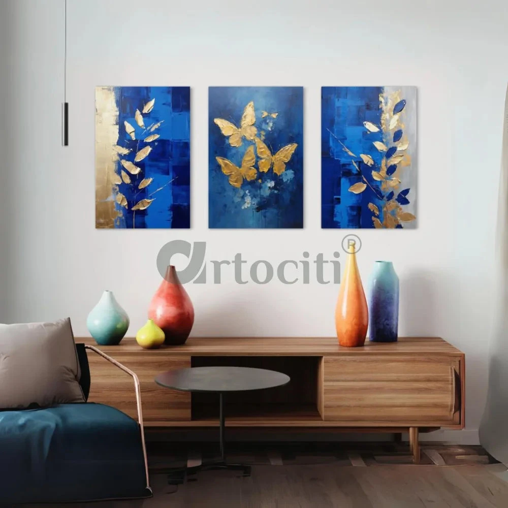 Elevate your decor with our exquisite Golden Butterfly and Leaves Canvas Art Set. This set of three stunning paintings features a majestic butterfly surrounded by intricate golden leaves in a harmonious blend of blue and gold hues. Available in two sizes: 12X18 inches and 24X16 inches and 30X20 inches, these artworks are printed on premium 380 gsm polycotton canvas using cutting-edge Canon printers for unparalleled detail and color vibrancy.