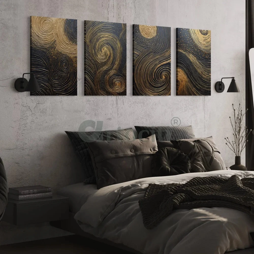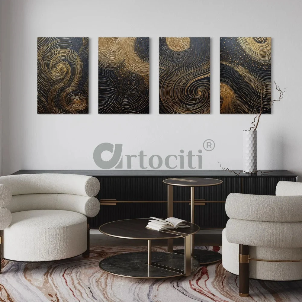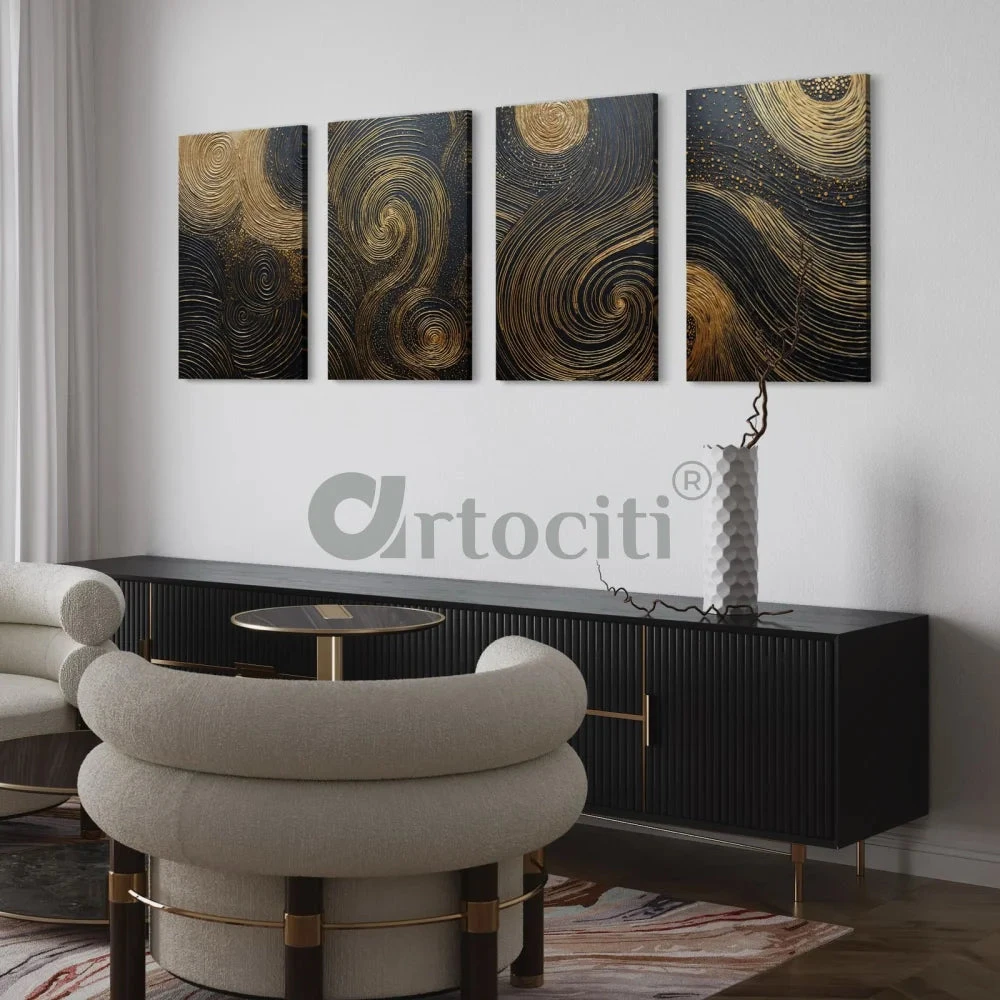 Indulge in opulence with our “Golden Elegance” Set of 4 Modern Abstract Canvas Prints. Sized at 24×16 Inches & 30×20 Inches each, this captivating quartet effortlessly enhances your space. Crafted on 380 GSM poly-cotton canvas, the prints boast a luxurious feel and durability. The mesmerizing combination of golden and black marble wood grain patterns adds a contemporary edge to any room. Elevate your decor with these high-quality Giclee prints, showcasing a perfect blend of modern aesthetics and timeless sophistication.