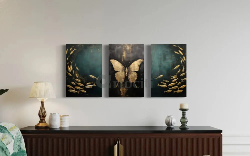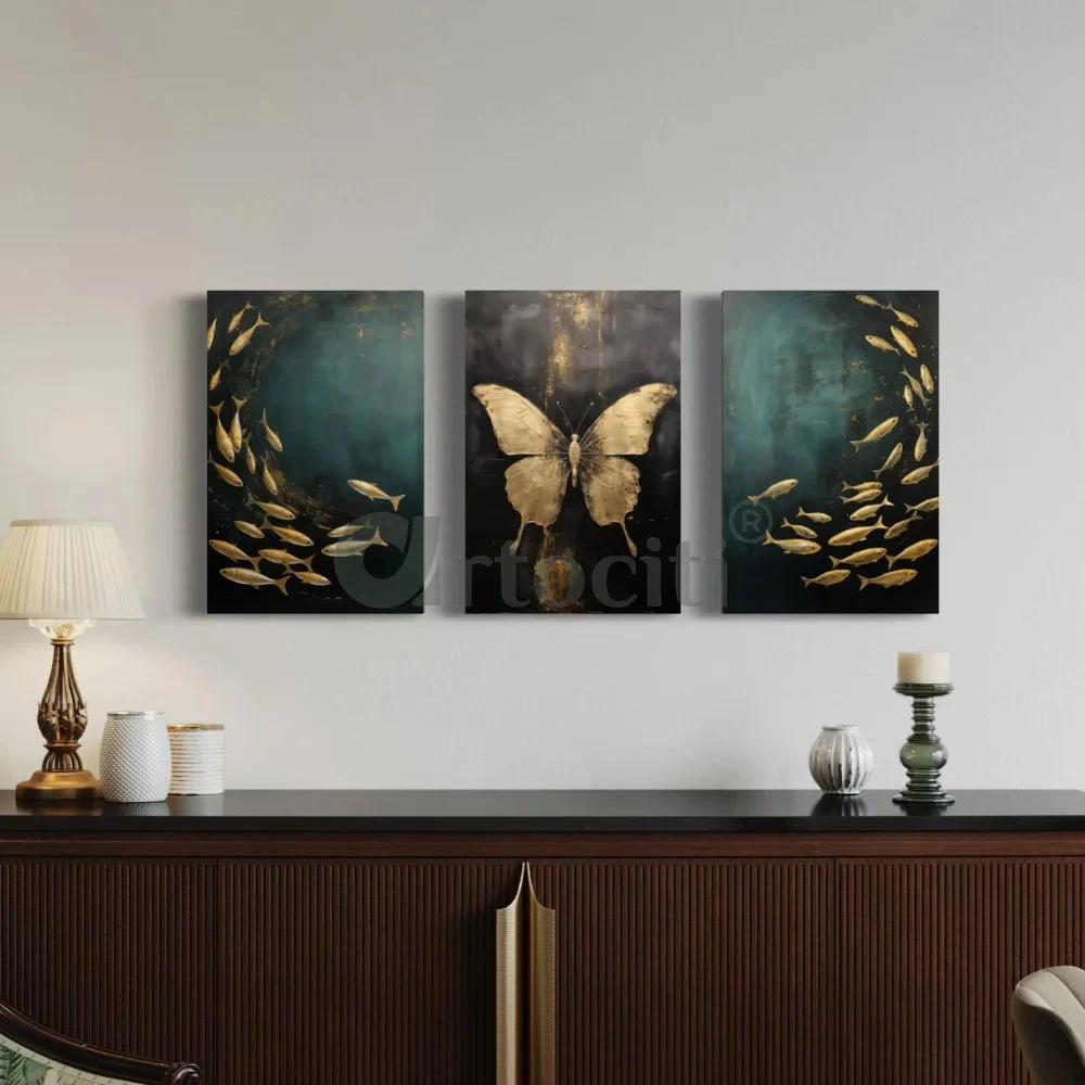 - Set of Three: Adorn your space with a trio of captivating butterfly and golden leaves artworks.