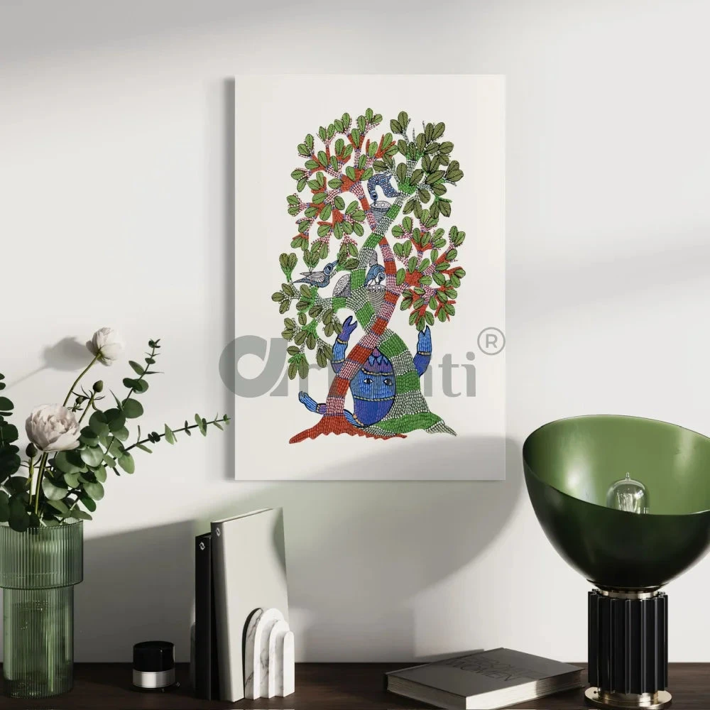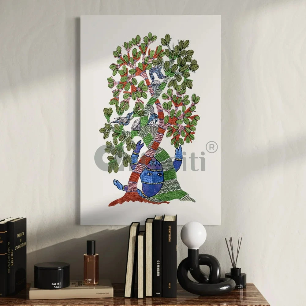 Immerse yourself in the ethereal beauty of the ‘Bird of Life’ Gond Art Painting, capturing a bird perched in a flourishing tree. Our Canvas Giclee Print, available in 24×16 inches and 30×20 inches, boasts vivid details on 380 GSM print, ensuring durability and brilliance. Transform your space with this unique masterpiece, blending tradition and contemporary art seamlessly. Elevate your home or office decor with the timeless charm of Gond artistry. Bring nature indoors and make a statement with this exquisite canvas print.