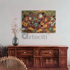 Immerse yourself in the rich heritage of Indian ethnic art with our exquisite Kerala mural painting portraying Krishna with his gopis. This masterpiece intricately captures the divine love and playfulness of the mythological tale in the distinctive Kerala mural style. Each brushstroke tells a story, as vibrant colors and detailed artistry bring the scene to life. Printed on premium 380 GSM polycotton canvas, it radiates both elegance and durability. Available in 12X18 inches and 16X24 inches and 20X30 inches and 32X48 inches, each piece is mounted on wooden frames, ensuring a gallery wrap quality that adds sophistication to your space while preserving the authenticity of this cultural treasure.