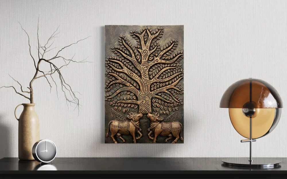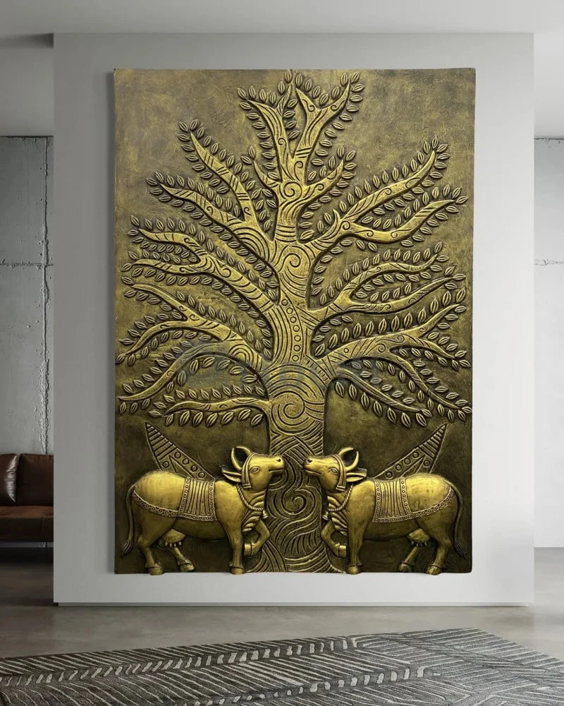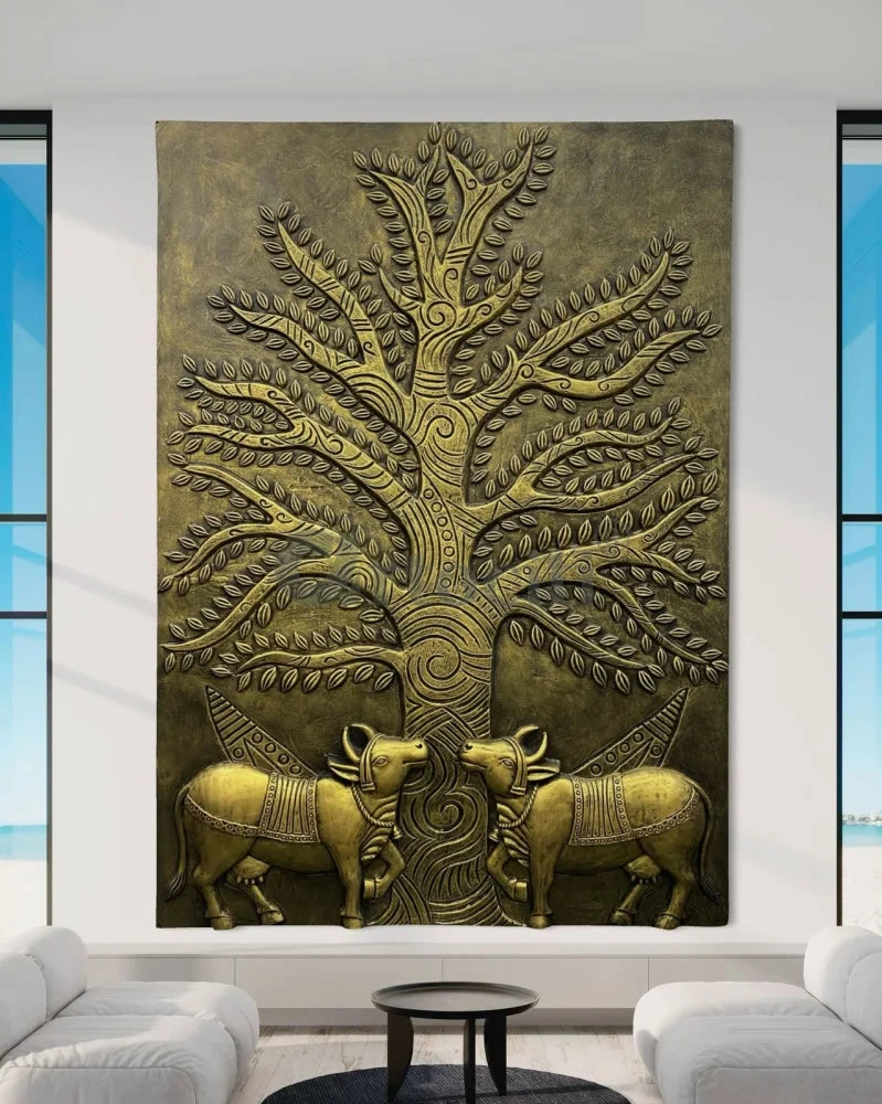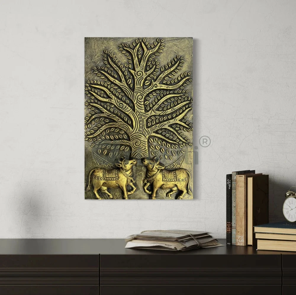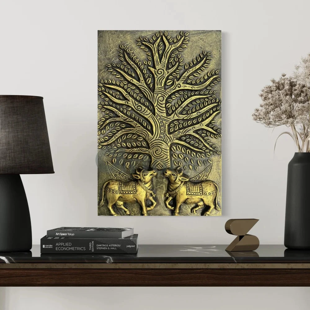 Immerse yourself in the divine allure of our Pichwai Cow with Tree of Life 3D Relief Mural Wall Art. This unique masterpiece, available in 24 X 16 inches and 7X5 Feet, adds a touch of opulence to your space. Choose from the exquisite BlackGolden or BlackBronze color options to suit your style. Crafted with precision, this 3D wall art captivates with its intricate details and spiritual symbolism. Elevate your decor with the divine aura of Pichwai artistry, bringing a blend of tradition and modern elegance. Make a statement and infuse your surroundings with timeless charm.
