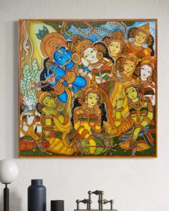 Immerse your living space in divine charm with this Krishna with Gopikas traditional Kerala mural-style Canvas Painting. Depicting Lord Krishna serenading his devoted gopikas with his enchanting flute, this artwork is a stunning blend of vibrant colors, intricate detailing, and cultural richness. Inspired by age-old Kerala mural traditions, this piece radiates spiritual serenity and artistic excellence.
