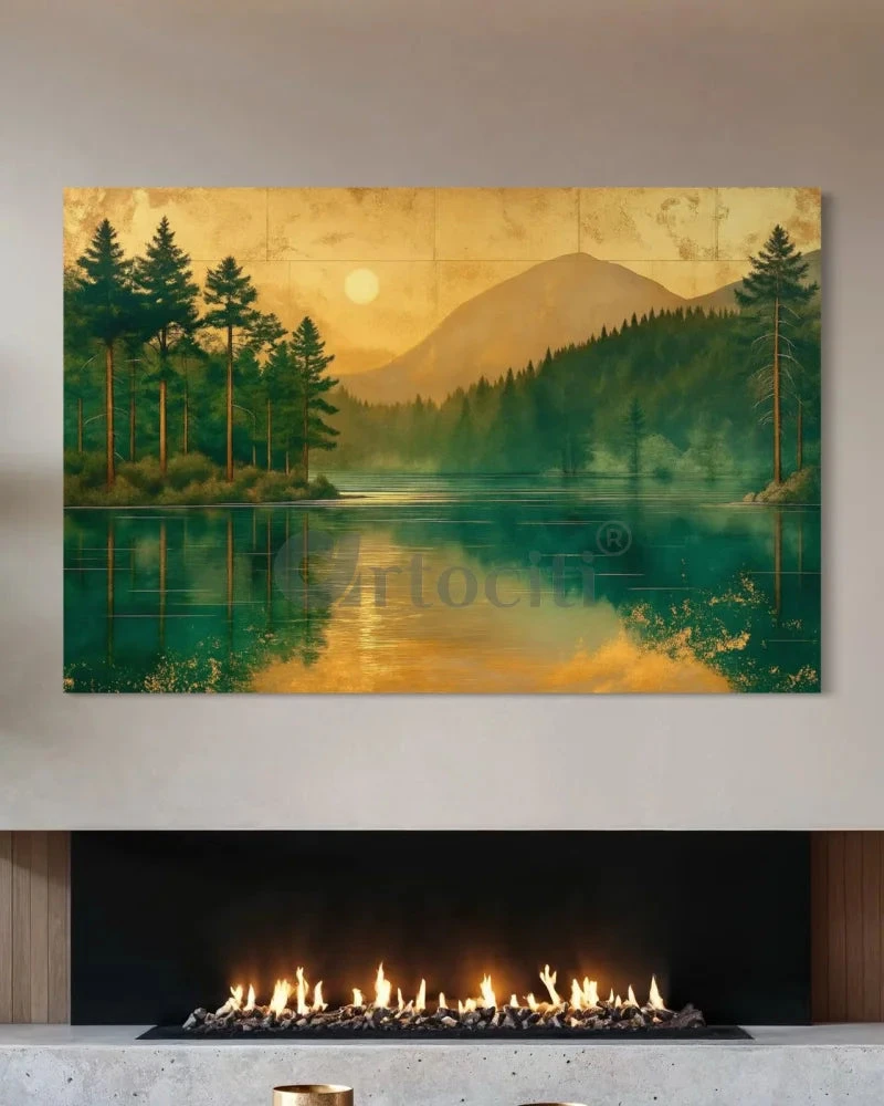 Bring home the tranquil beauty of nature with Golden Serenity Lake, a modern abstract canvas painting that captures a serene forest landscape bathed in golden twilight. Featuring a harmonious blend of towering pine trees, misty mountains, and reflective lake waters, this artwork evokes a deep sense of peace and balance. The golden glow of the setting sun against the rich green and teal hues creates a striking, meditative ambiance—perfect for modern, rustic, or nature-inspired interiors.