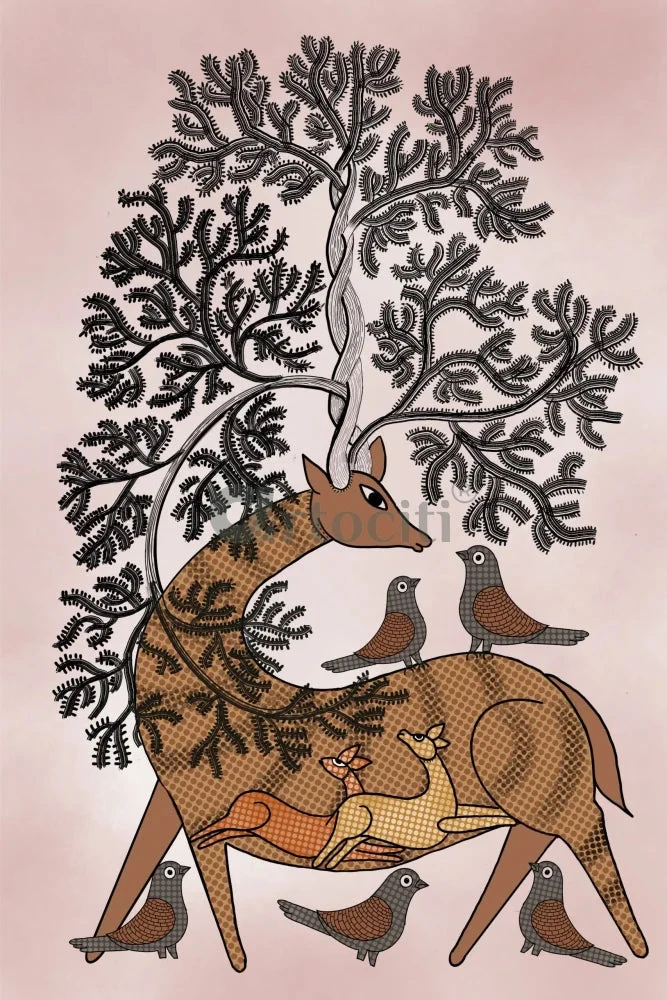Gond art is a form of painting from folk and tribal art that is practiced by one of the largest tribes in India โ the Gond โ who are predominantly from Madhya Pradesh. The work of Gond artists is rooted in their folk tales and culture, and thus story-telling is a strong element of every painting. Gond paintings can be described as ‘on line work’.ย Art is created out of carefully drawn lines. Lines are used in such a way to convey a sense of movement to still images. Dots and dashes are added to impart a greater sense of movement and increase the amount of detail.