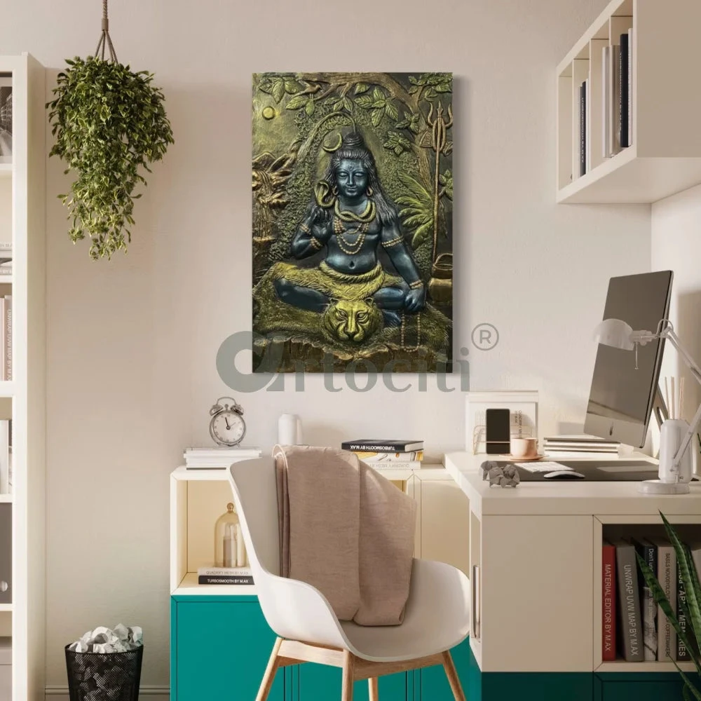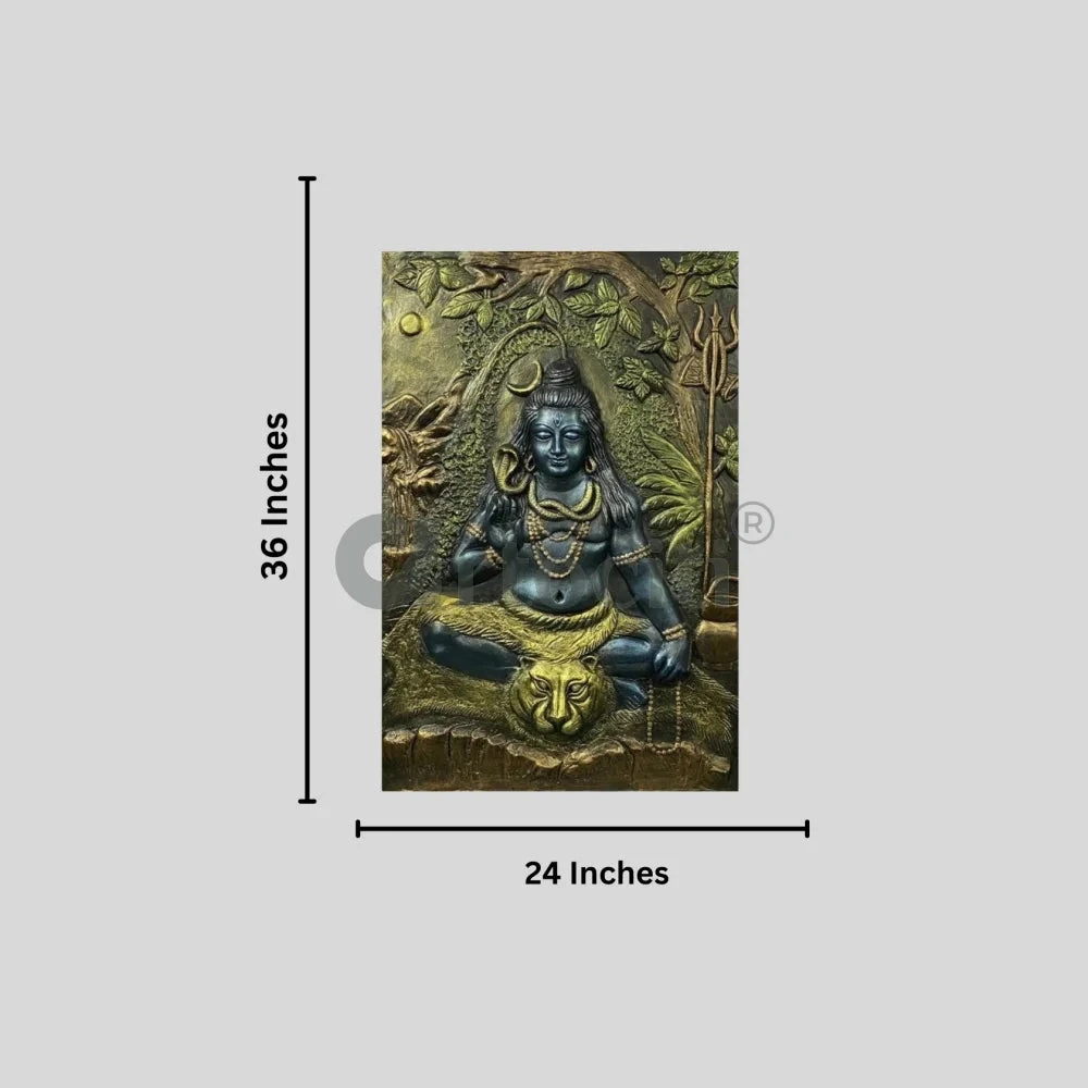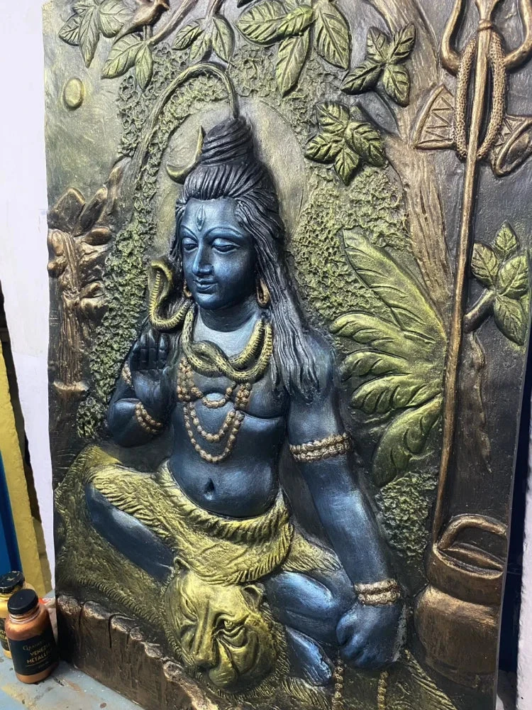 Lord Shiva is the Supreme Being in Shaivism, one of the major traditions within Hinduism. Shiva is known as “The Destroyer” within the Trimurti, the Hindu trinity which also includes Brahma and Vishnu. In the Shaivite tradition, Shiva is the Supreme Lord who creates, protects and transforms the universe. This unique 3D Relief wall art of Lord Shiv, is coloured in multicolor metallic tone of blues, greens and bronze.