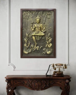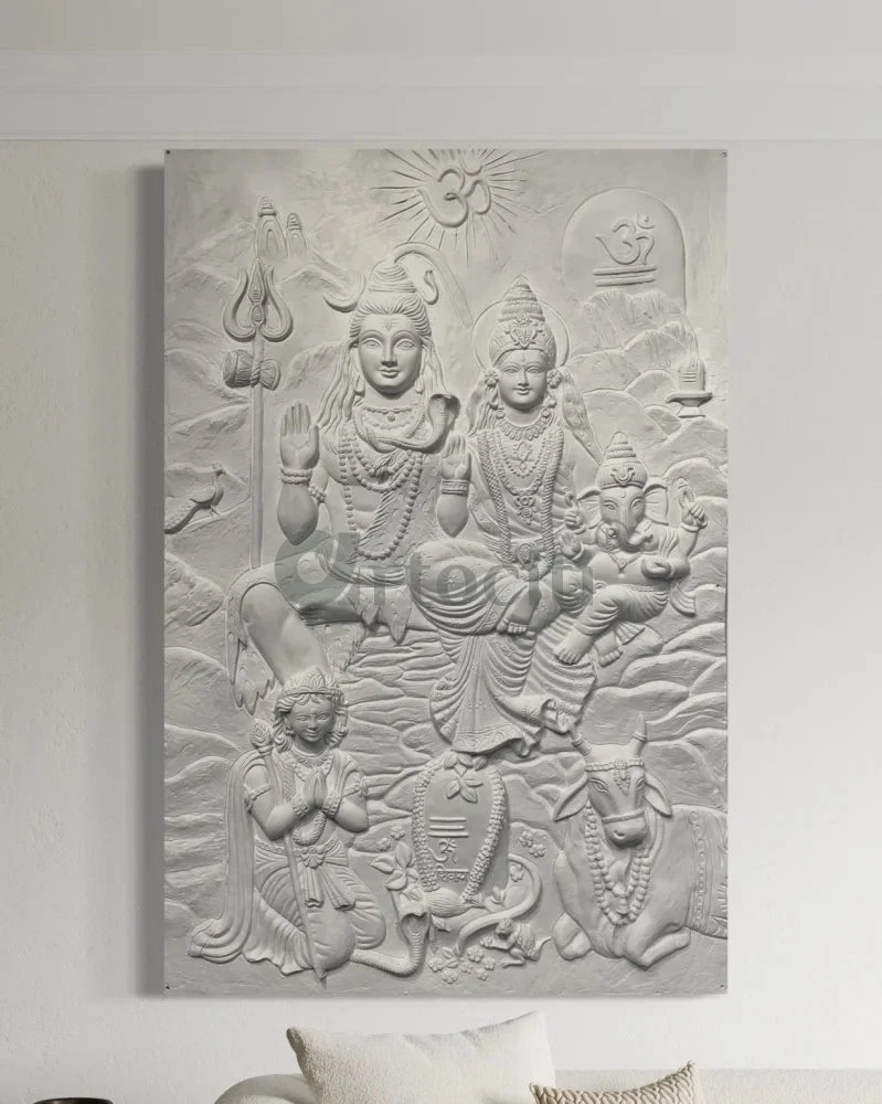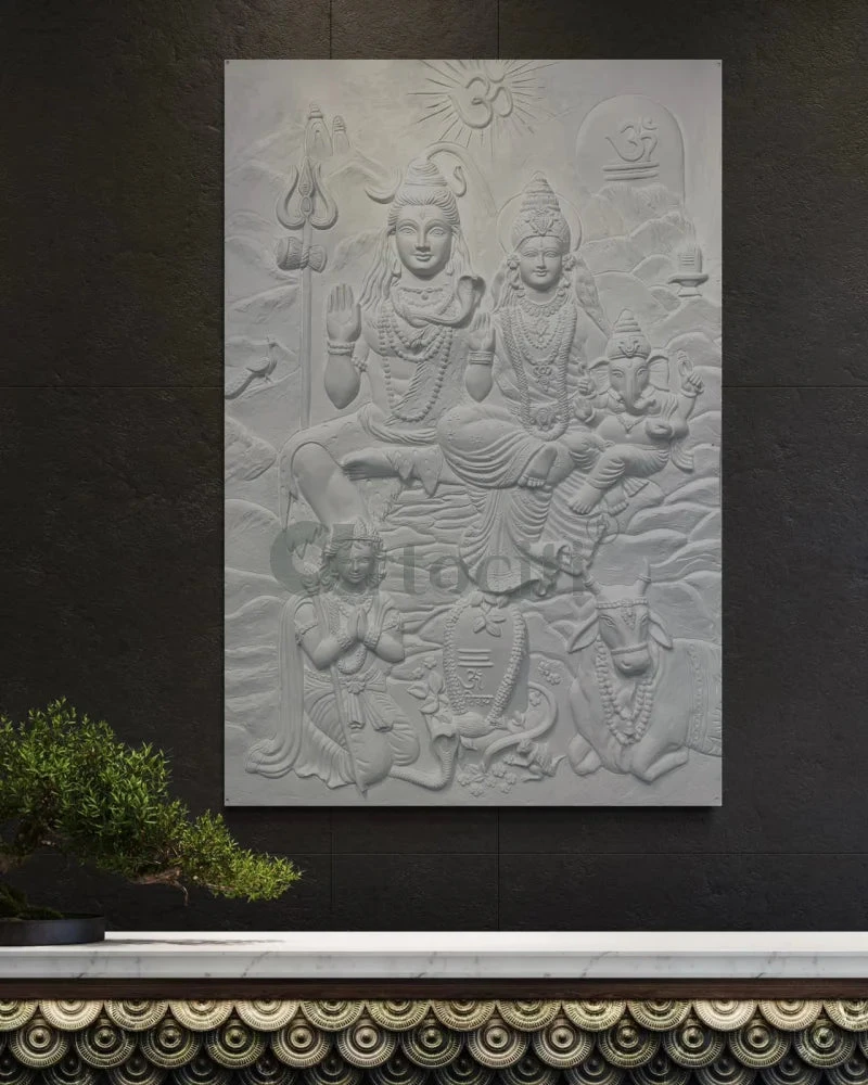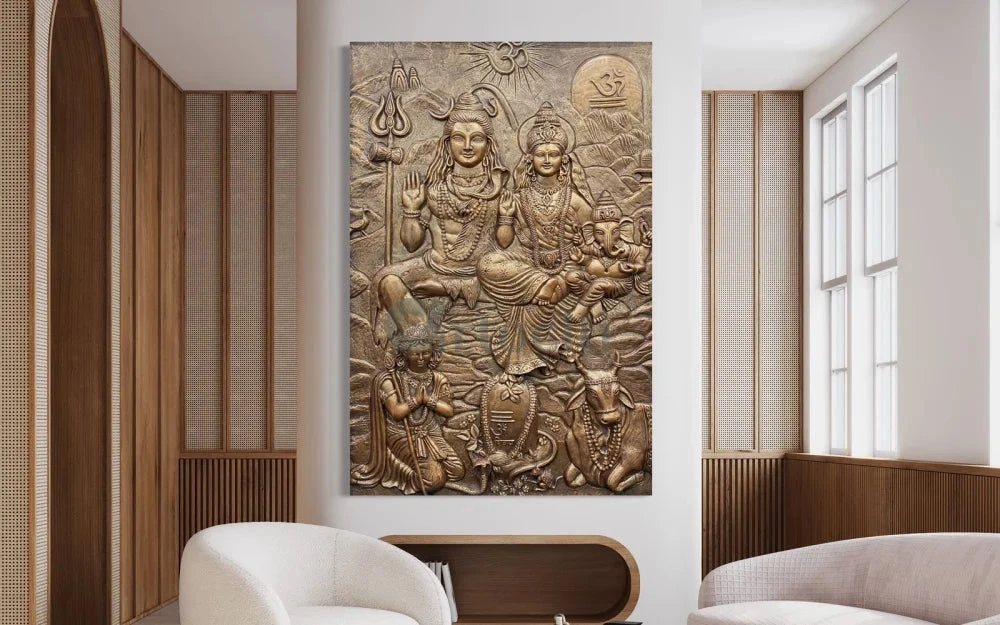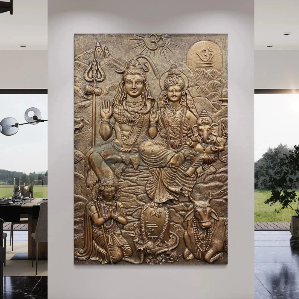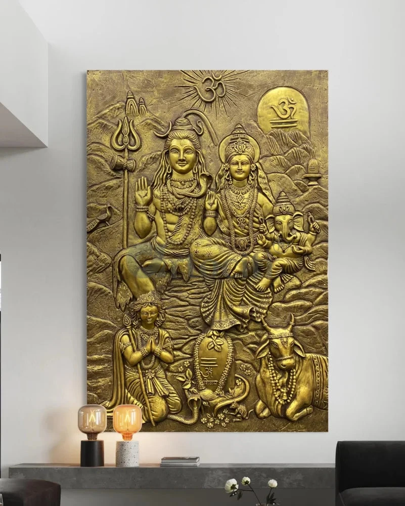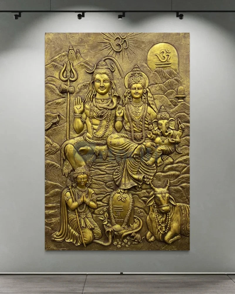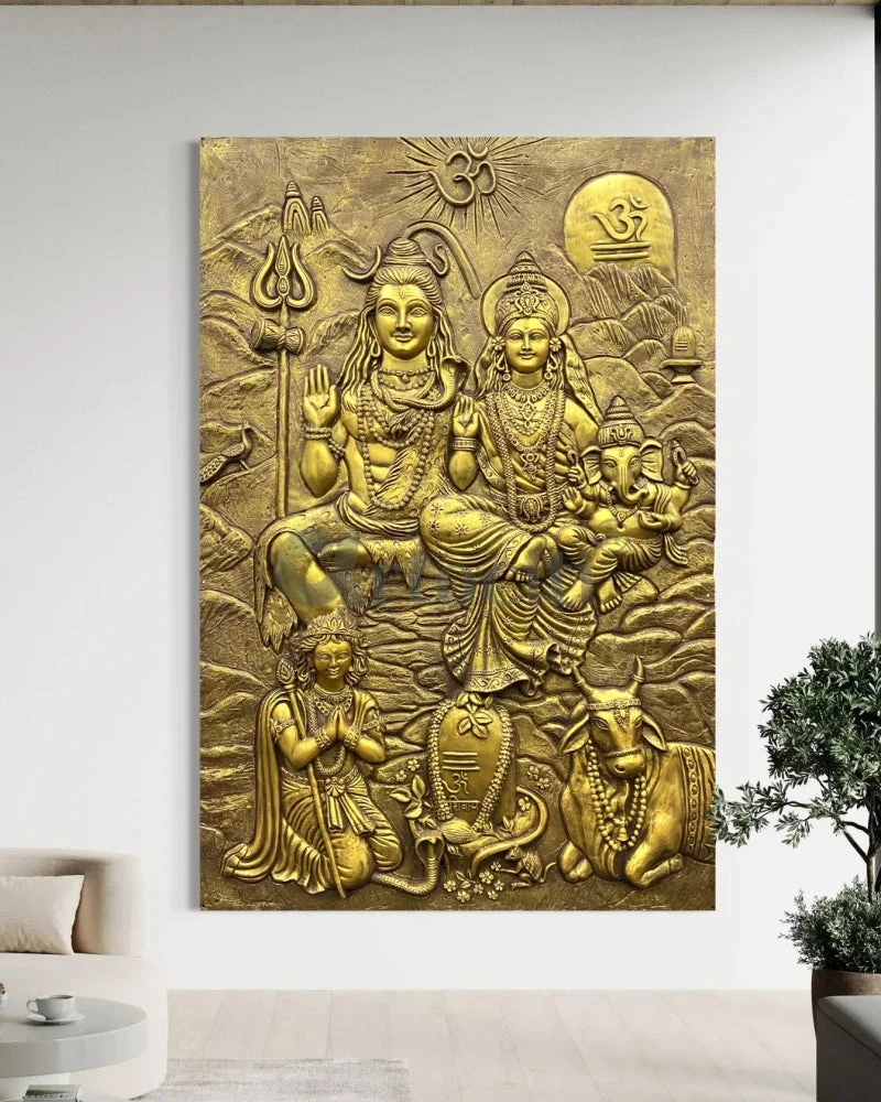 Transform your space with the Lord Shiv Parivar 3D Relief Mural Wall Art. This stunning 3D wall art is a perfect blend of spirituality and artistry. Measuring 72 x 48 inches (6 x 4 feet) approx and available in elegant bronze and golden color options, it adds a divine touch to any setting. Please note that this unframed piece requires onsite installation to ensure a seamless fit.