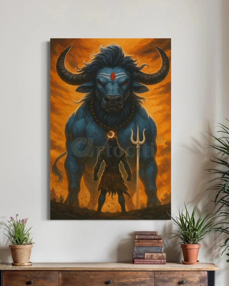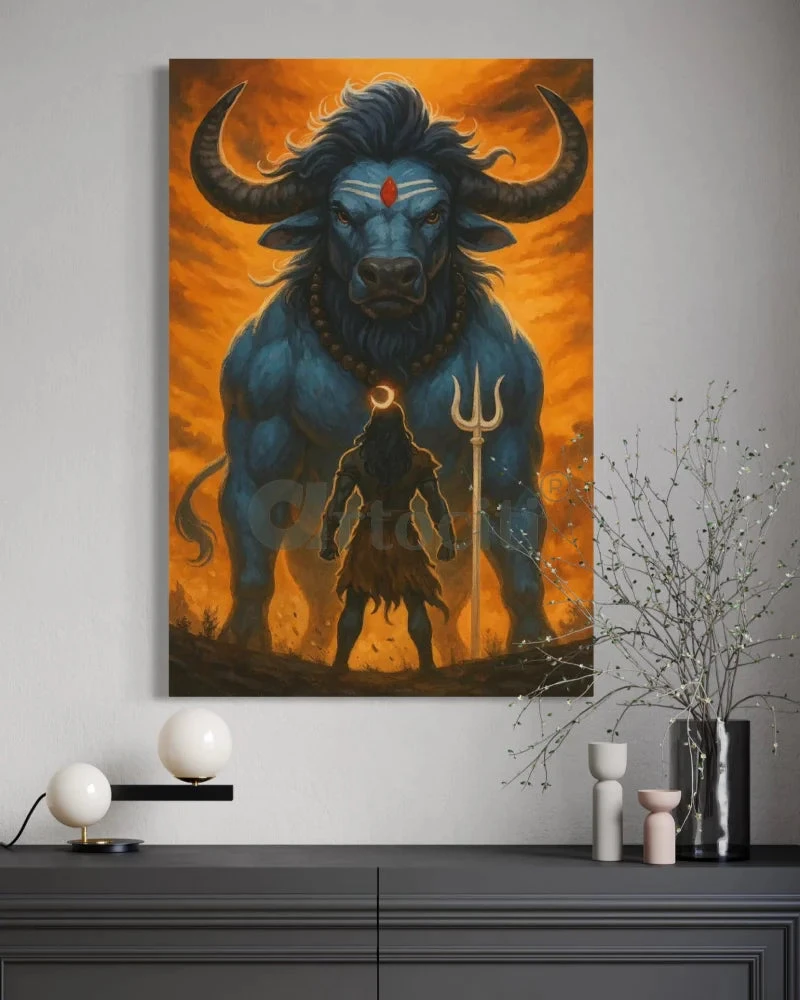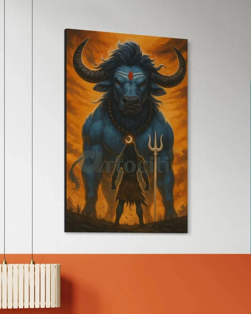 Bring home the embodiment of divine strength and devotion with this stunning Lord Shiva and Nandi Canvas Painting. This artwork captures a powerful moment between Mahadev (Lord Shiva) and Nandi, his sacred bull and devoted companion. Set against a backdrop of celestial fire and symbolic intensity, this painting beautifully reflects the fierce serenity and cosmic power of Lord Shiva.