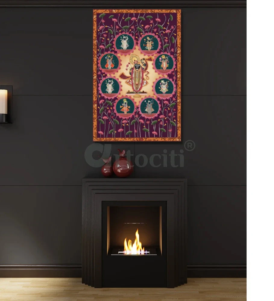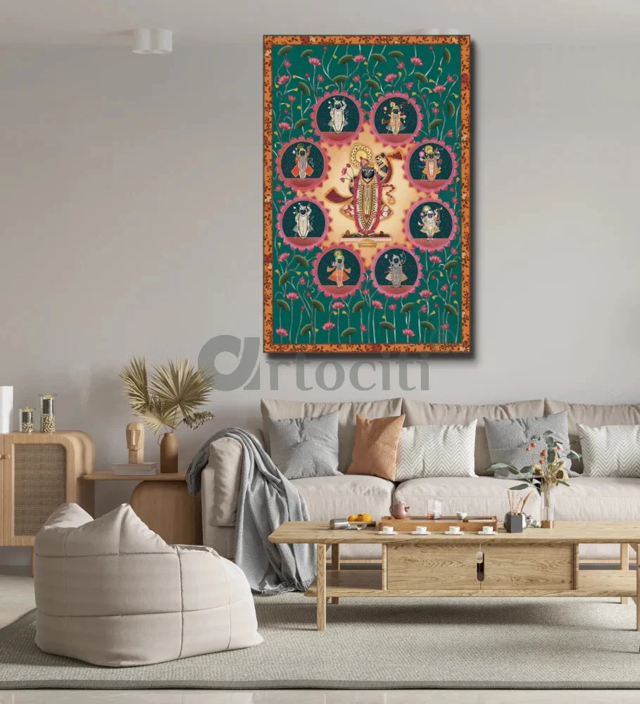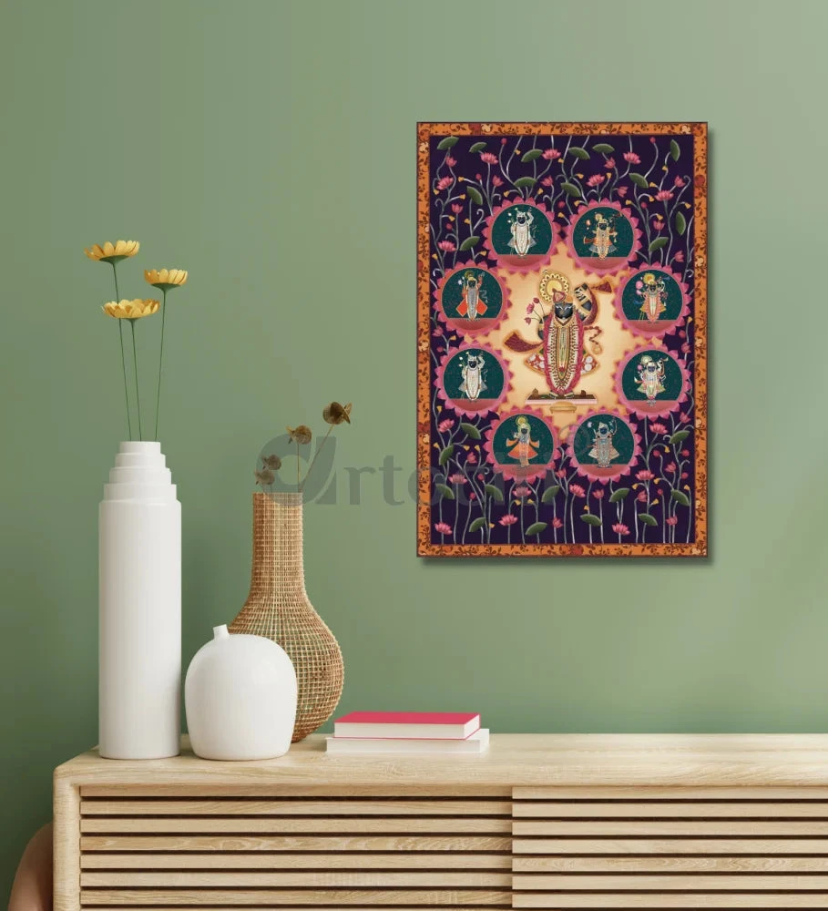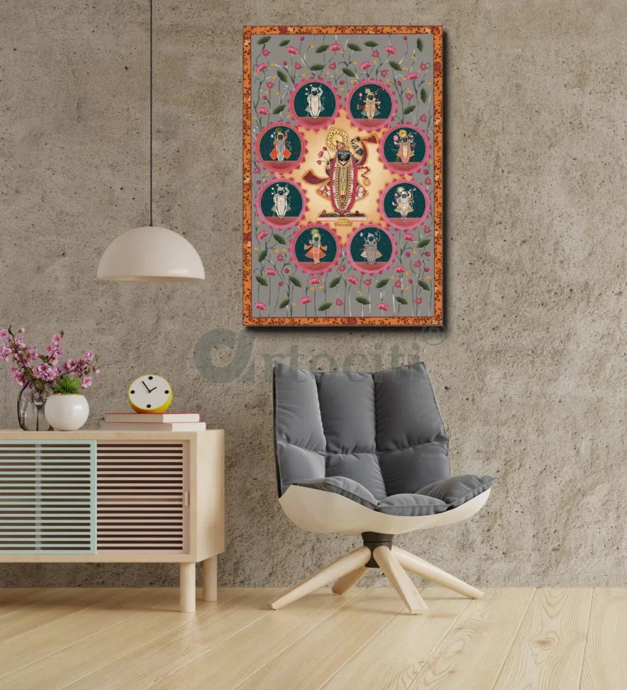 Elevate your spiritual space with our Lord Shreenath Ji Pichwai Canvas Giclee Print, available in sizes 24×16 and 30×20 inches. Choose from a palette of Pink, Blue, Green, Yellow, or Grey to match your decor. This captivating artwork is expertly crafted on 380 GSM canvas, ensuring lasting beauty. If you desire a different color, contact us! Infuse your home with divine grace, and make this sacred masterpiece a centerpiece in any room. Experience the divine presence of Lord Shreenath Ji through vibrant hues, and bring serenity and devotion into your life.