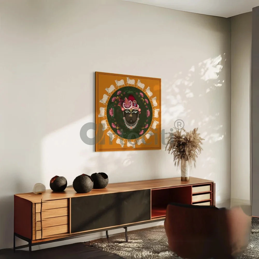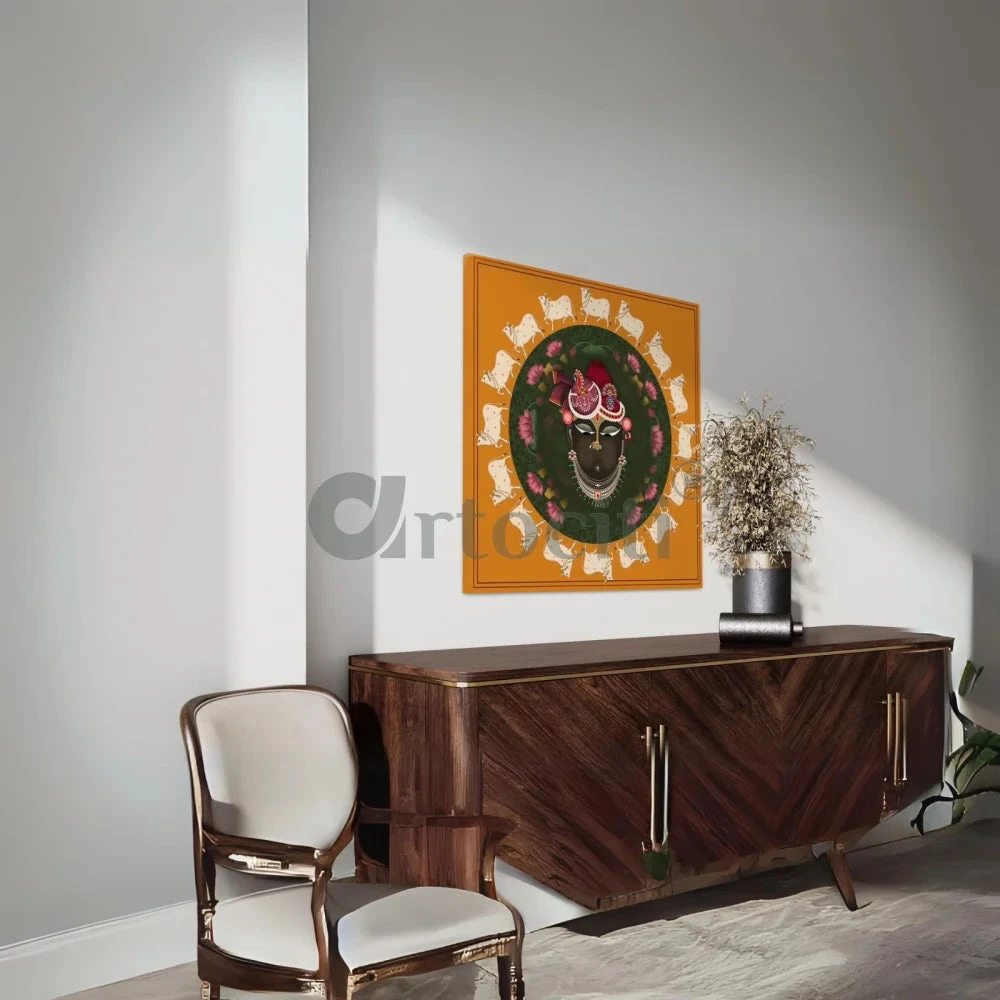 Immerse your space in celestial serenity with our Circular Lord Shreenath Ji Pichwai Canvas Giclée Print. Available in 18×18 inches, 22×22 inches, and 32×32 inches, this masterpiece radiates spiritual energy. Crafted on 380 GSM canvas for enduring vibrancy, it’s customizable in various colors—contact us for your perfect shade. Elevate your decor with the timeless elegance of circular art inspired by Lord Shreenath Ji. If you crave divine sophistication and personalized aesthetics, this canvas is a must-have. Order now and let the divine embrace your surroundings.