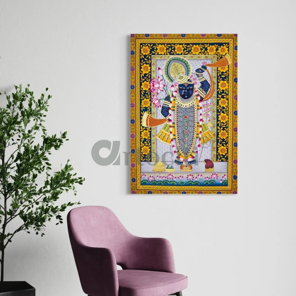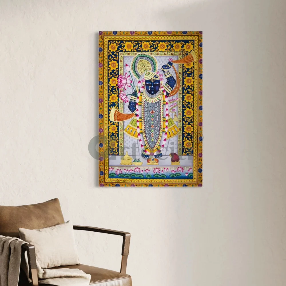Elevate your space with the mesmerizing Lord Shreenath Ji Pichwai in Yellow-White, a stunning traditional art Canvas Giclee Print. Available in two sizes, 24×16 inches and 30×20 inches, this masterpiece embodies serenity and spirituality. Crafted with precision on a high-quality 380 GSM canvas, the print radiates vivid colors and intricate details. Customize in your preferred color by reaching out. Bring home the divine aura of Lord Shreenath Ji with this timeless piece.