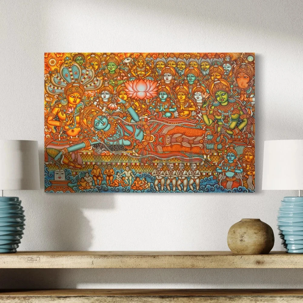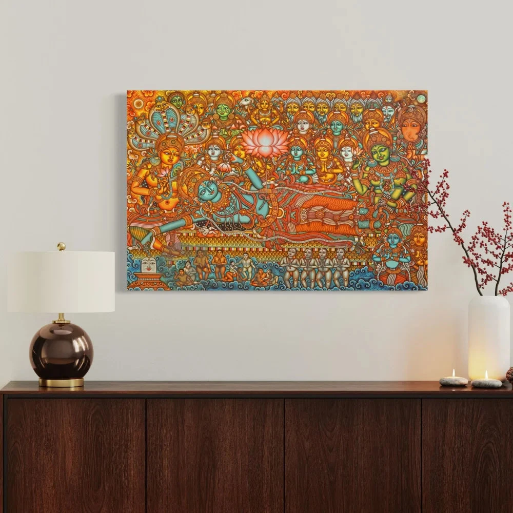 Immerse yourself in the divine elegance of our Lord Vishnu Kerala Mural Canvas Painting, a remarkable piece of art that brings the spiritual essence of Vishnu into your home. This exquisite painting is available in two sizes: 16×24 inches (40.64×60.96 cm) and 20×30 inches (50.8×76.2 cm), perfect for enhancing any living space.
