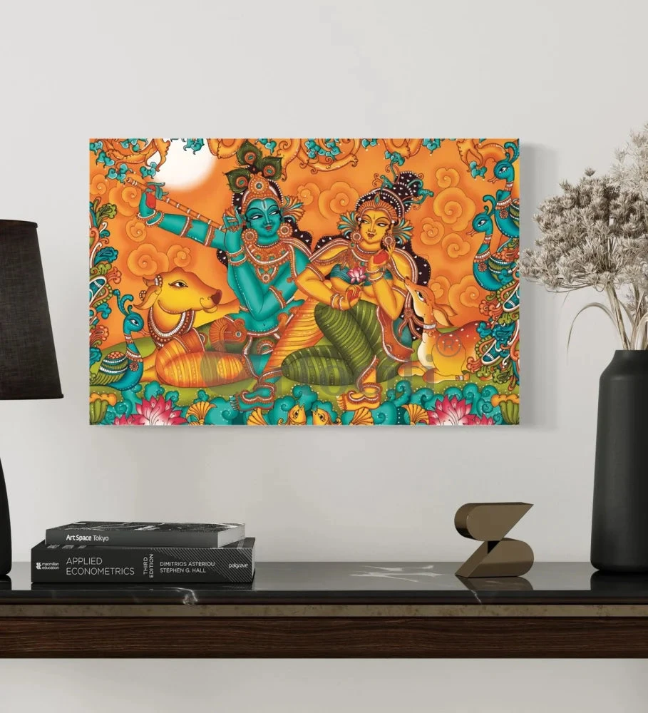 - Kerala mural canvas: Krishna with bansuri, Radha, cow, and deer