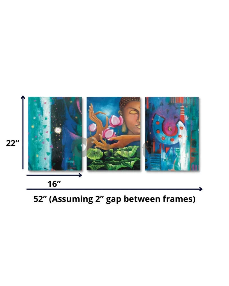 This painting depicts Meditating Buddha look in the middle and on the sides, are 2 beautiful abstract artwork. This absorbing wall art with vibrant and bright colours will make your wall look vivid and aesthetic! It will look beautiful against both neutral toned walls and bright coloured walls. It can also be a great gift to loved ones or for festive gifting purposes.