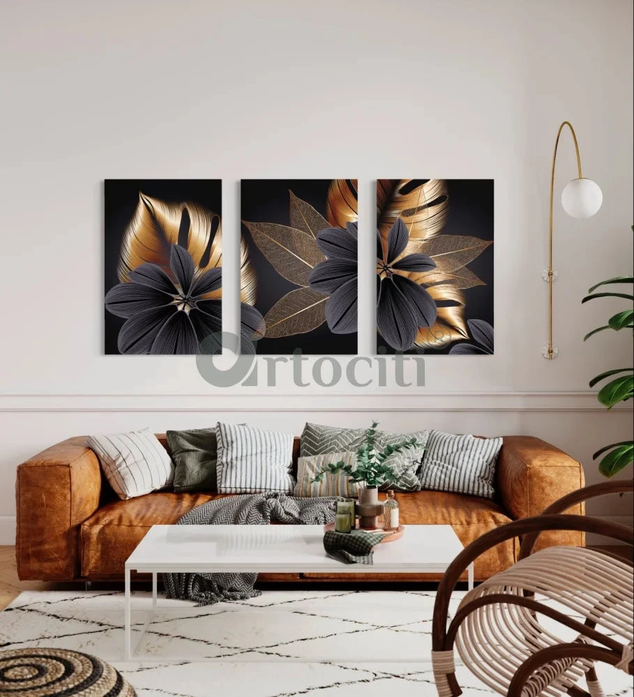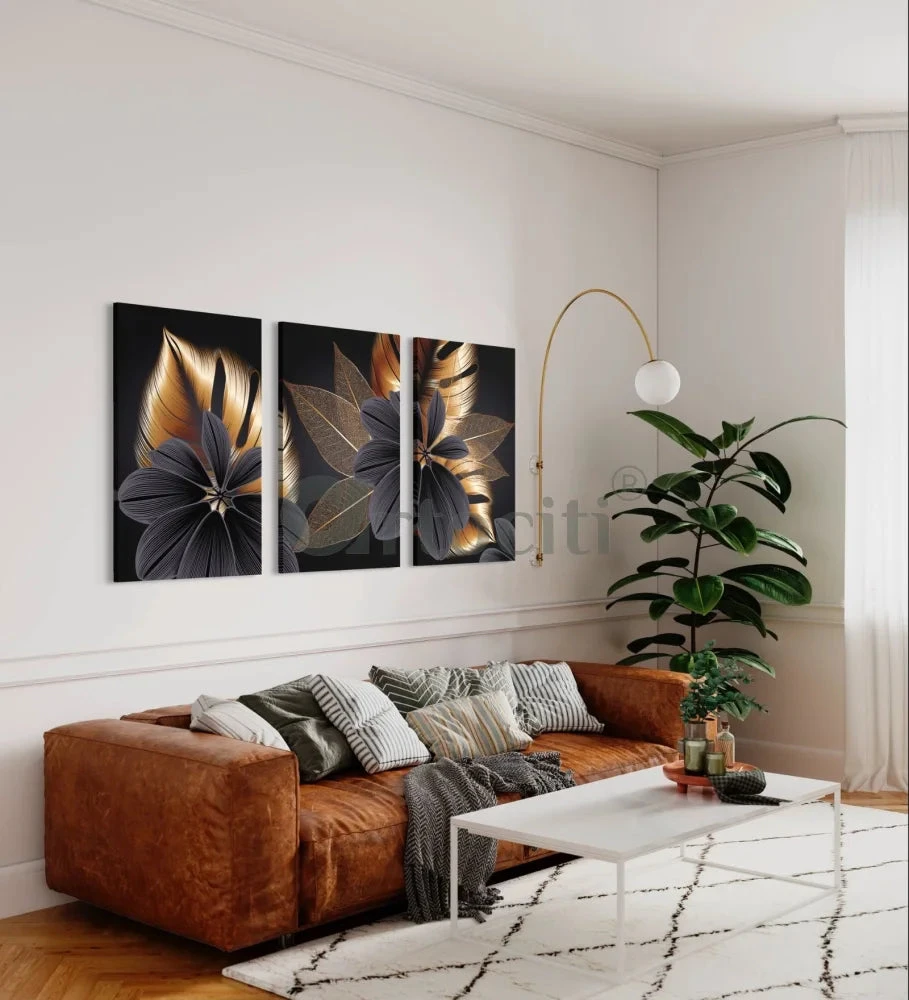 This set of 3 paintings is an exclusively designed wall decor modern art depicting abstract flowers and leaves. It will add charm and liveliness your room decor. Furthermore, this wall art adds soul to your living space. This absorbing wall art in golden and black tones will make your wall look vivid and aesthetic! It will look beautiful against both neutral toned walls and bright coloured walls. It can also be a great gift to loved ones or for festive gifting purposes.