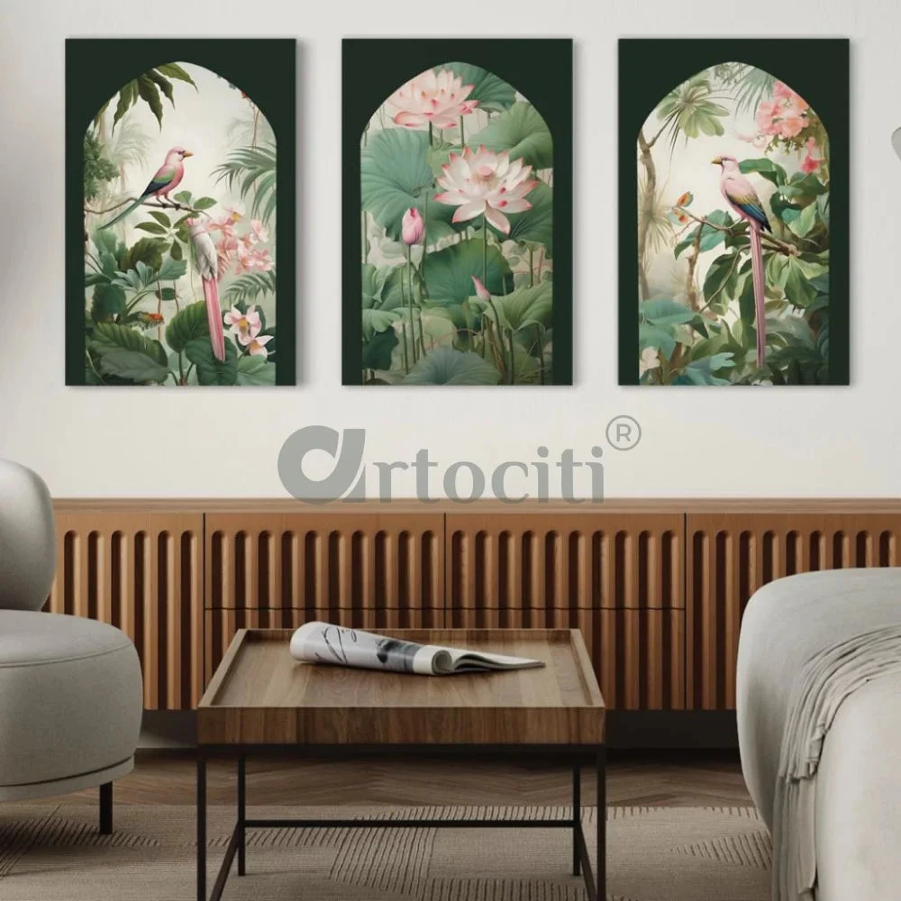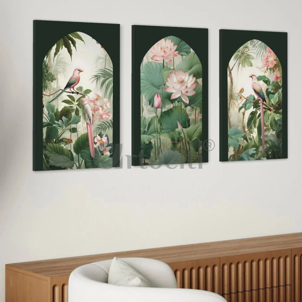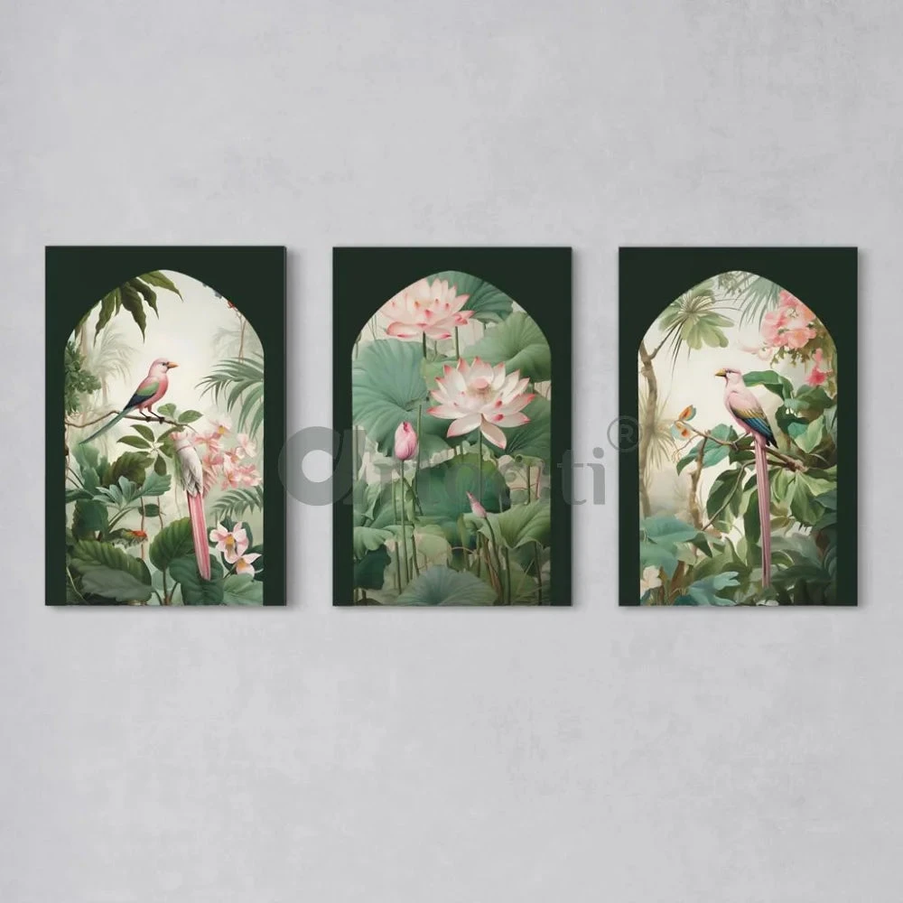 - Pichwai-Inspired Trio: Vibrant parrots and lotus flowers.