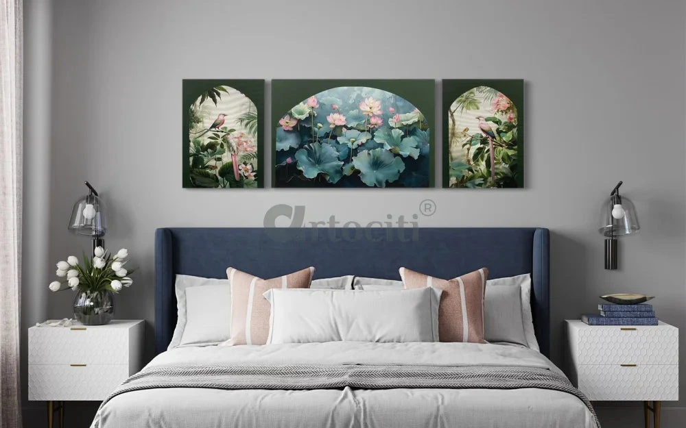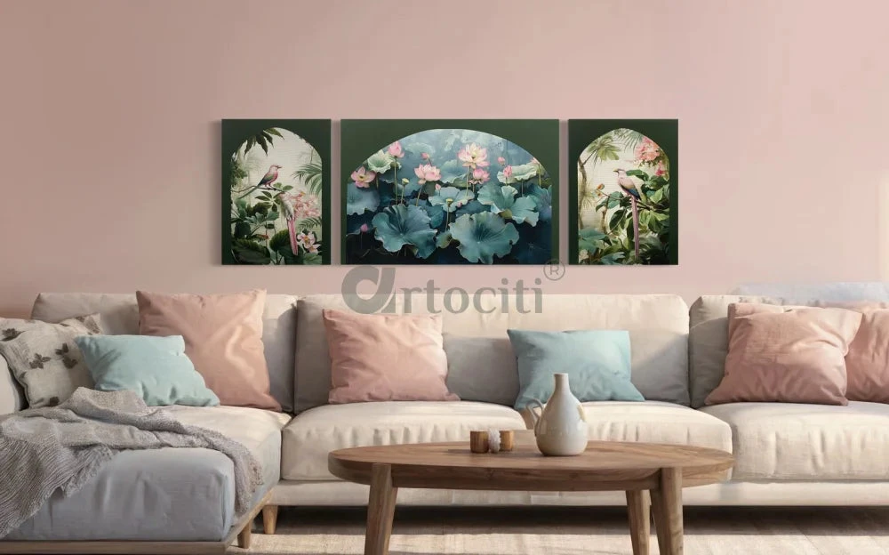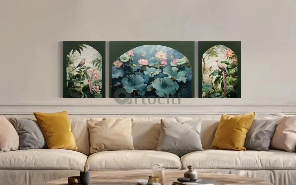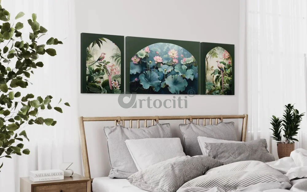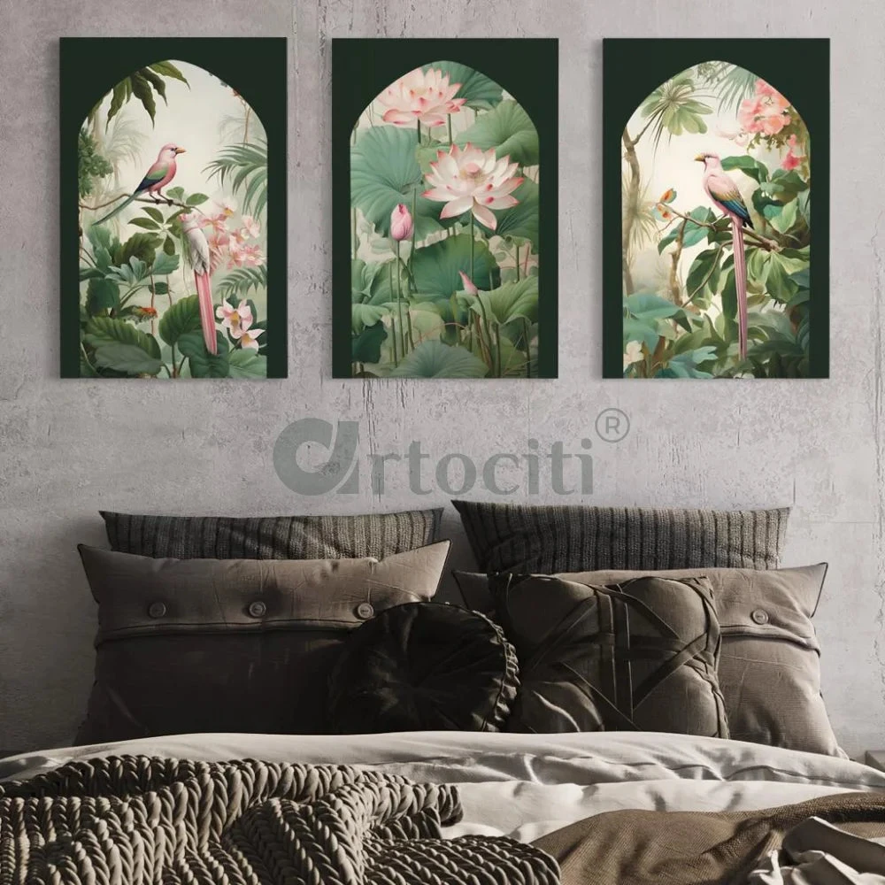 - Pichwai-Inspired Trio: Vibrant parrots and lotus flowers.