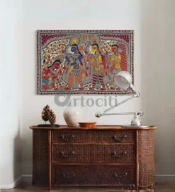 Ram Janki Madhubani Painting Canvas Giclee Print(Illuminate Your Space With Matte Ram Janki Darbar Madhubani Painting Exquisite Canvas Giclee Print In 24×16 30×20 Inches)