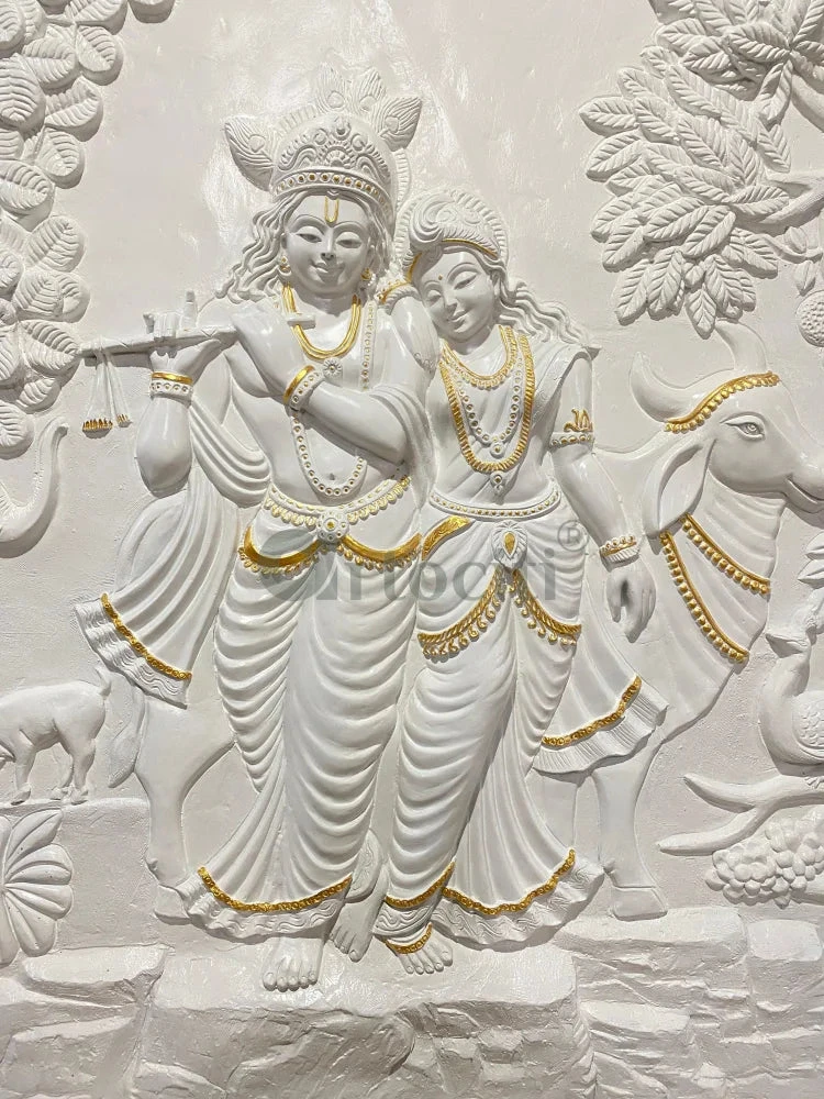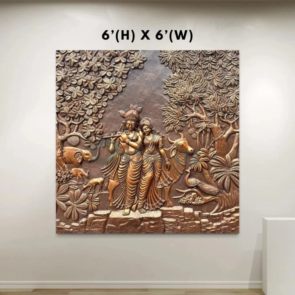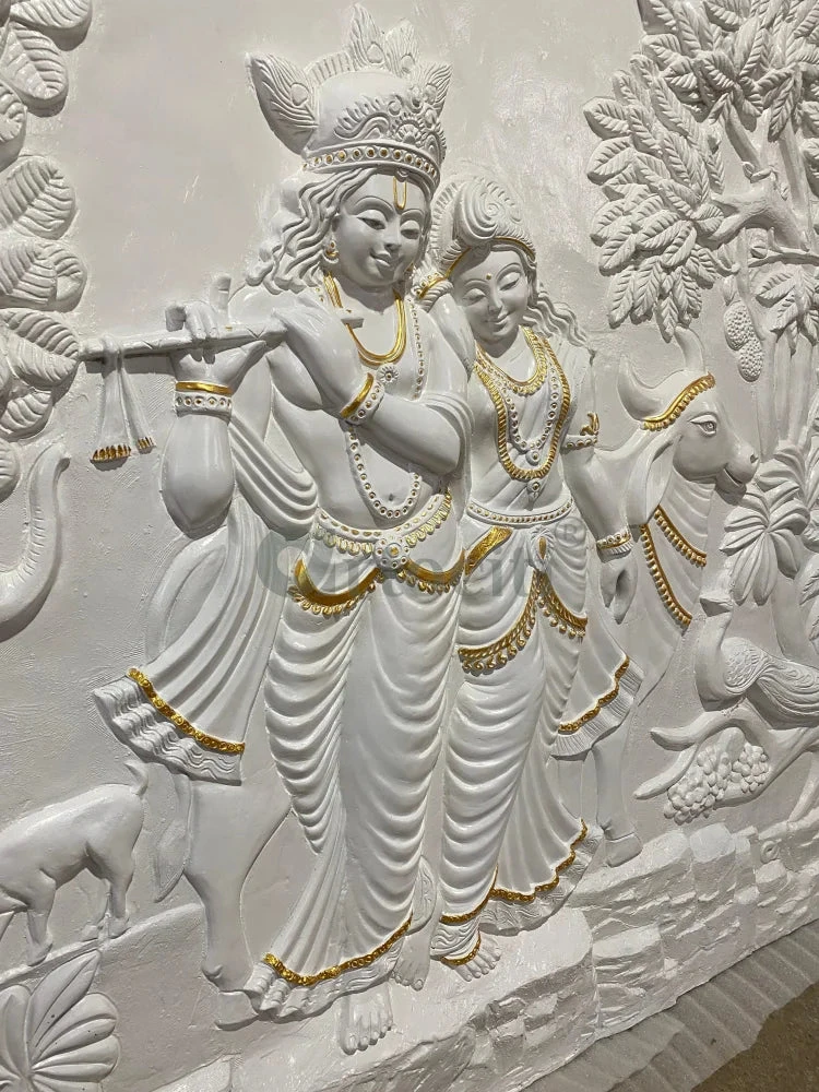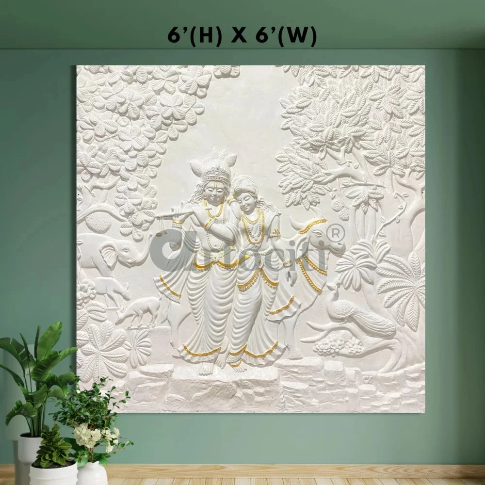 Enhance your living space with this exquisite Krishna-Radha 3D Relief Mural Wall Art, beautifully depicting the divine couple alongside cows in a serene, nature-inspired setting. Crafted with intricate details, this mural offers a stunning visual experience, showcasing the artistry in every element from the figures to the lush foliage. Ideal for homes, meditation spaces, and temples, it brings a touch of spirituality and tranquility to any room.
