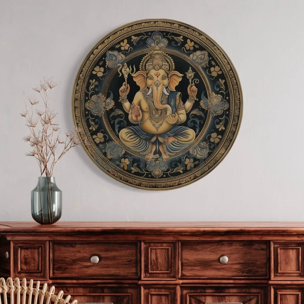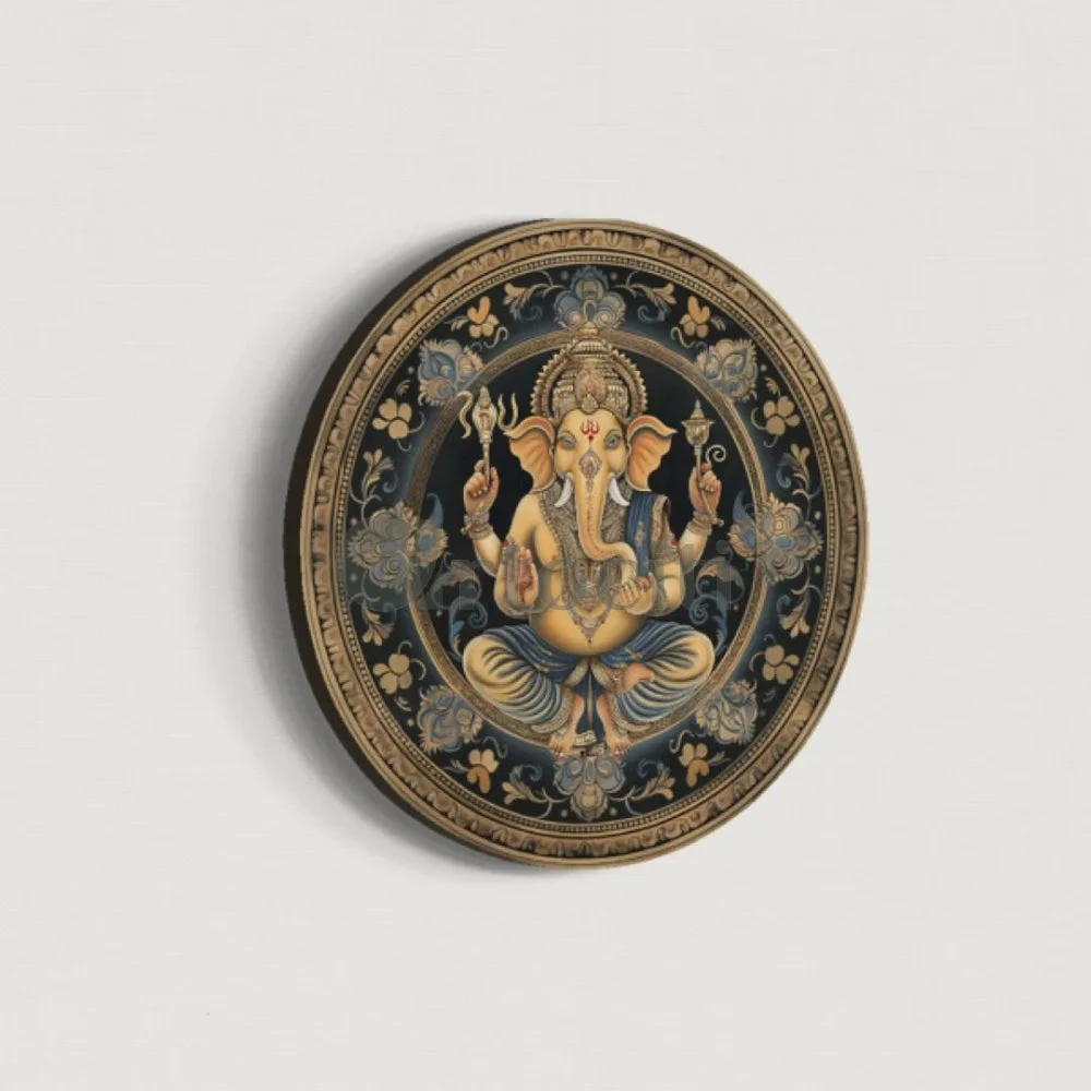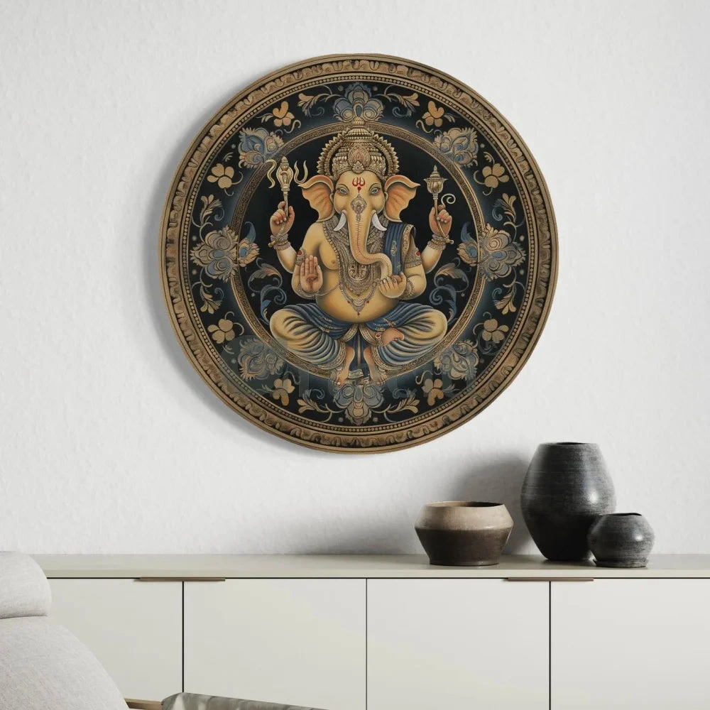 Elevate your home décor with the Round Ganesha painting Canvas Giclee Print. Available in sizes 16×16 inches, 20×20 inches, and 32×32 inches, this exquisite artwork is printed on 380 GSM canvas and mounted on round-shaped wooden plywood. The vibrant colors and intricate details make this piece a captivating addition to any room.