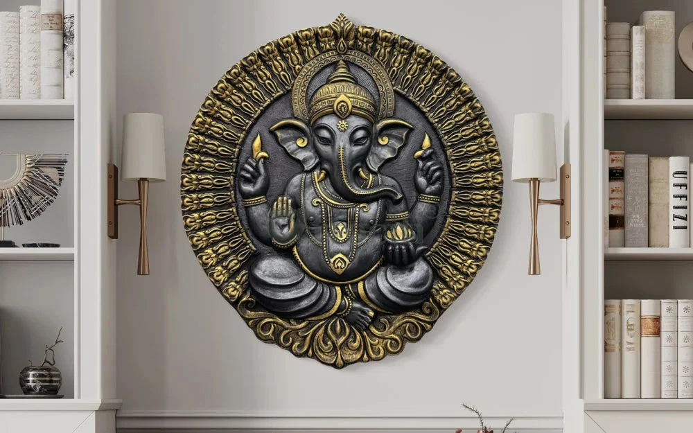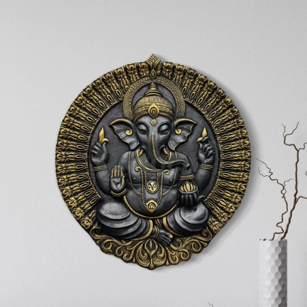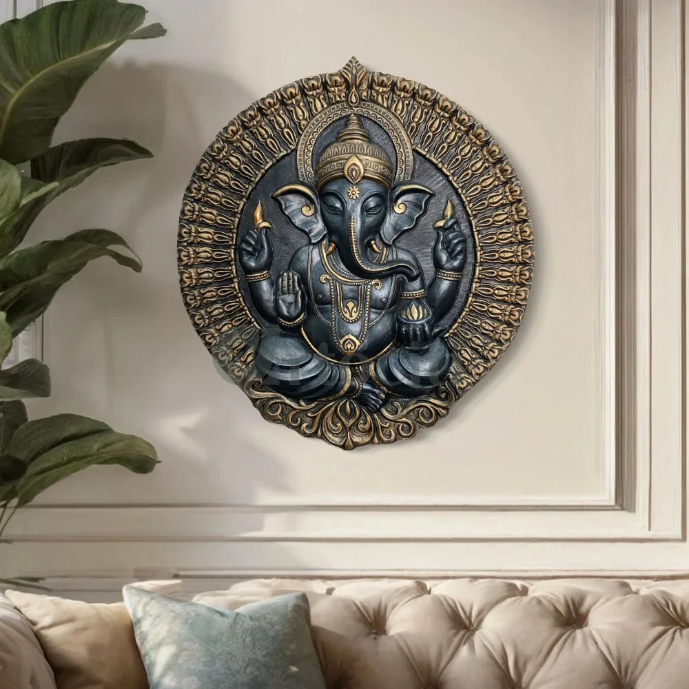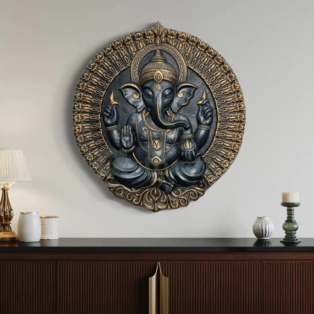 Elevate your home decor with the exquisite Round Ganesha 3D Relief Mural Wall Art. This unique 3D wall art is available in a striking 42 X 36 inches (3.5X3 feet, 106.6X91.5 cm) size. Choose between elegant black with golden highlights or sophisticated black with bronze highlights. Perfectly round and ready to hang, it brings divine charm and artistic sophistication to any space.