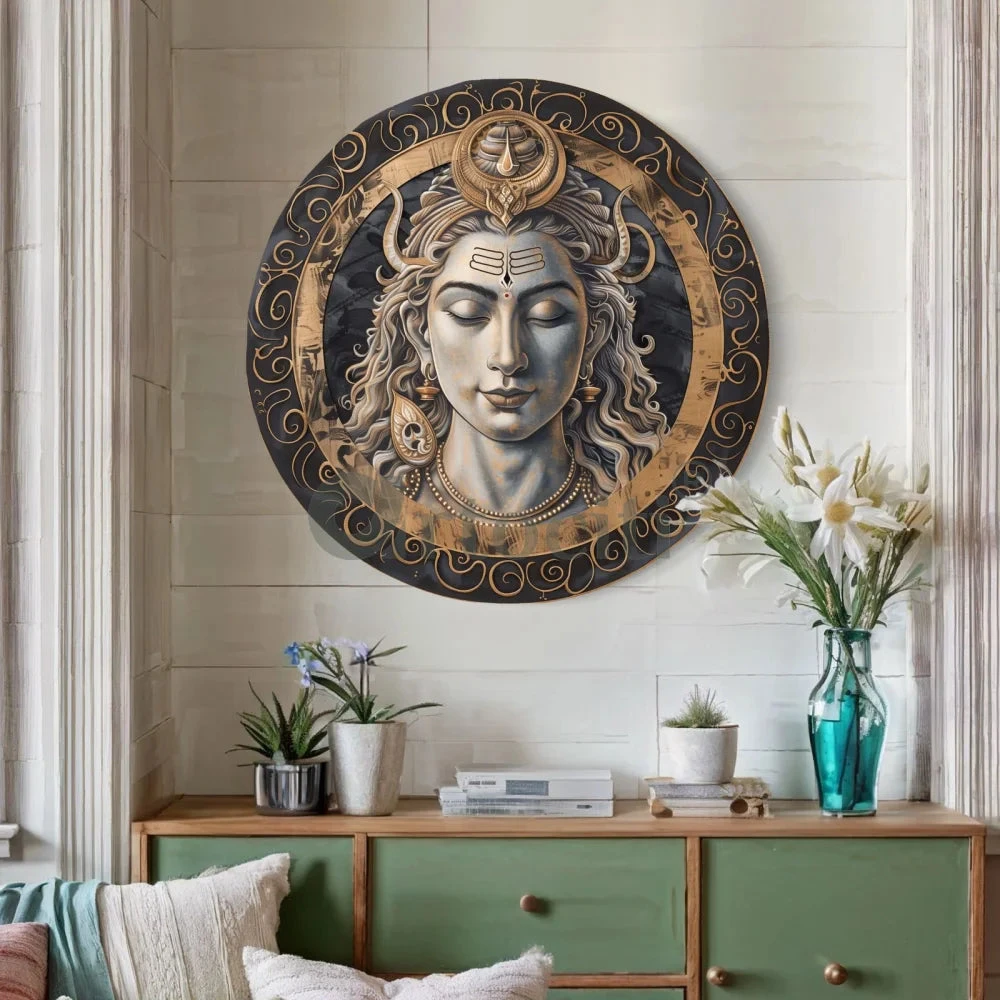 Elevate your space with our stunning Round Shiv Ji painting Canvas Giclee Print. Available in 16X16 Inches (40.6X40.6 Cm Approx), 20X20 Inches (50.8X50.8 Cm Approx), and 32X32 inches (81.2X81.2 Cm Approx), this artwork is a perfect blend of spirituality and art. Printed on high-quality 380 GSM canvas and mounted on round-shaped wooden plywood, it adds a divine touch to your decor.