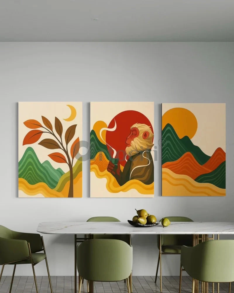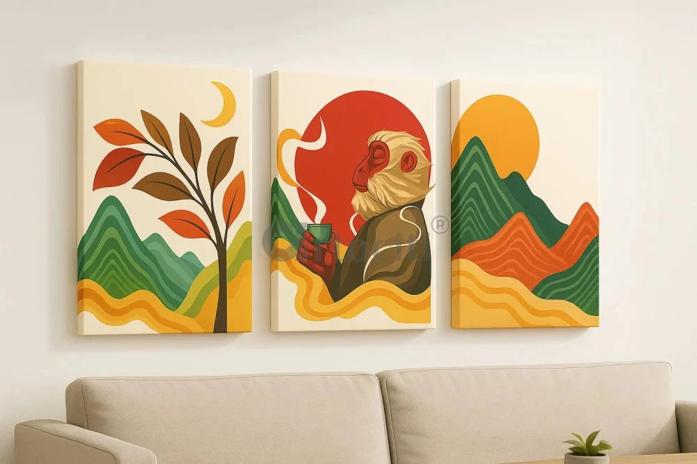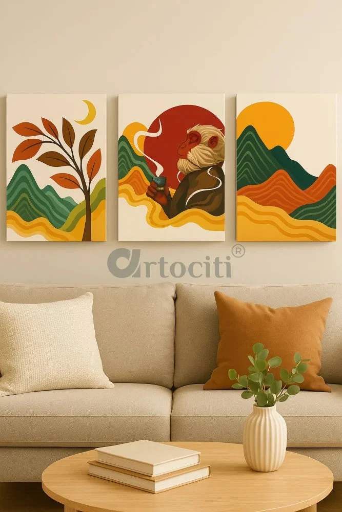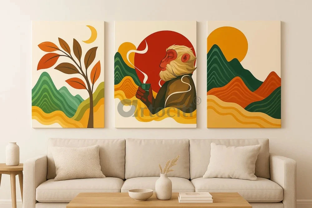 Bring balance, color, and soulful character to your space with this Set of 3 Boho Chic Abstract Canvas Paintings. This art series features a serene monkey sipping tea amid stylized landscapes, wavy mountains, abstract trees, and celestial elements – all designed in rich earth tones and modern bohemian aesthetics.