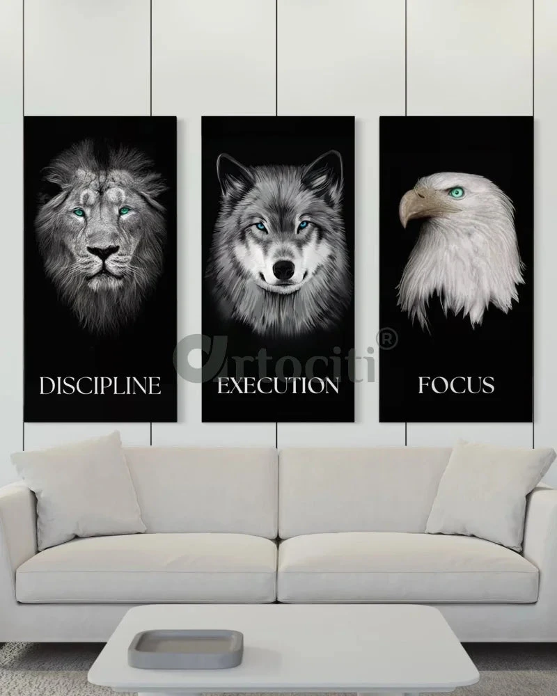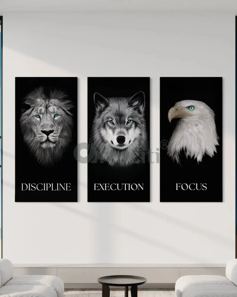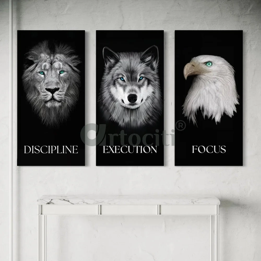 Elevate your space with this Set of 3 Motivational Canvas Paintings featuring powerful animal portraits paired with inspiring words: Discipline (Lion), Execution (Wolf), and Focus (Eagle). These monochrome masterpieces with striking blue-green eyes against a bold black background are more than just decor—they’re daily reminders of your inner strength and vision.