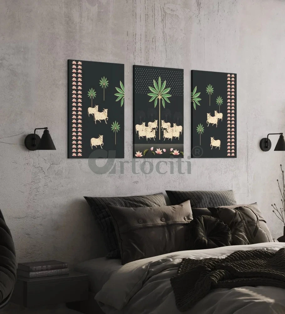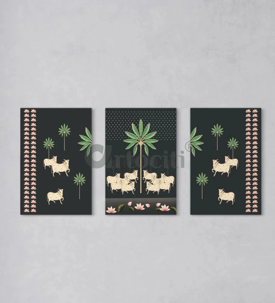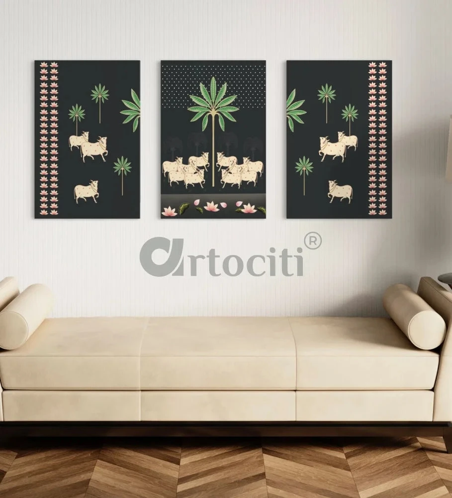 Elevate your decor with our Set of 3 Cow Pichwai Canvas Prints, each expertly printed on 380gsm polycotton canvas using Canon’s top-of-the-line printers. These exquisite artworks capture the beauty and essence of traditional Pichwai paintings, showcasing the sacred cows in intricate detail and vibrant colors. Bring a touch of timeless elegance and spiritual significance to your space with this premium-quality art set.