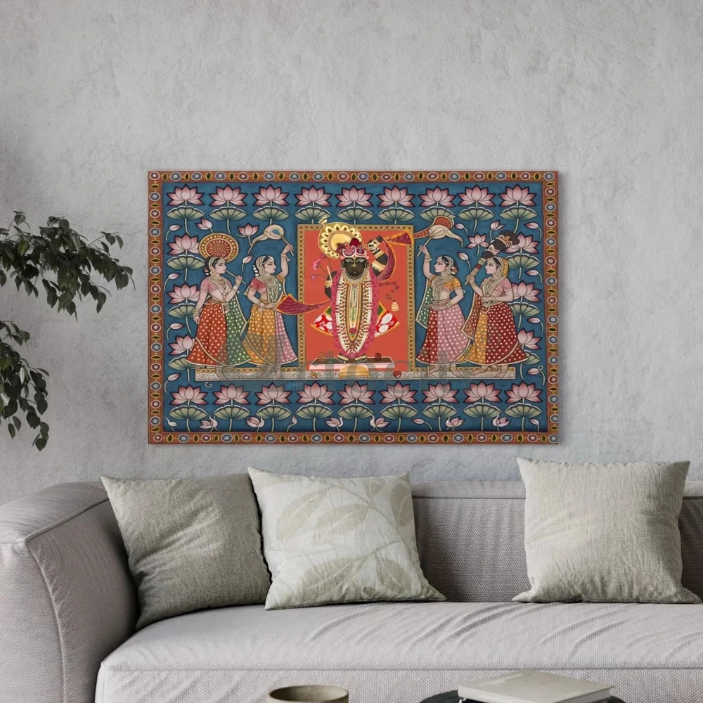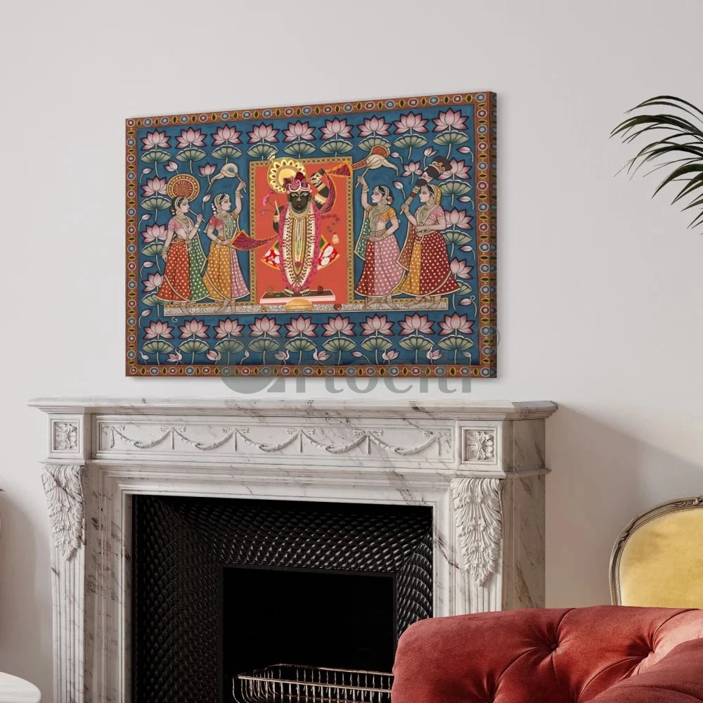 Immerse your surroundings in celestial vibes with our Lord Shreenath Ji Pichwai Canvas Giclee Print. Available in 24×16 and 30×20 inches, this masterpiece captures the divine essence in every detail. Crafted on a premium 380 GSM canvas, the print boasts unparalleled richness and durability. Elevate your home or office with the spiritual allure of Shreenath Ji. Each stroke on the canvas is a testament to craftsmanship, ensuring an awe-inspiring addition to your decor. Bring blessings and beauty together with this exquisite piece that transcends art into a spiritual experience.
