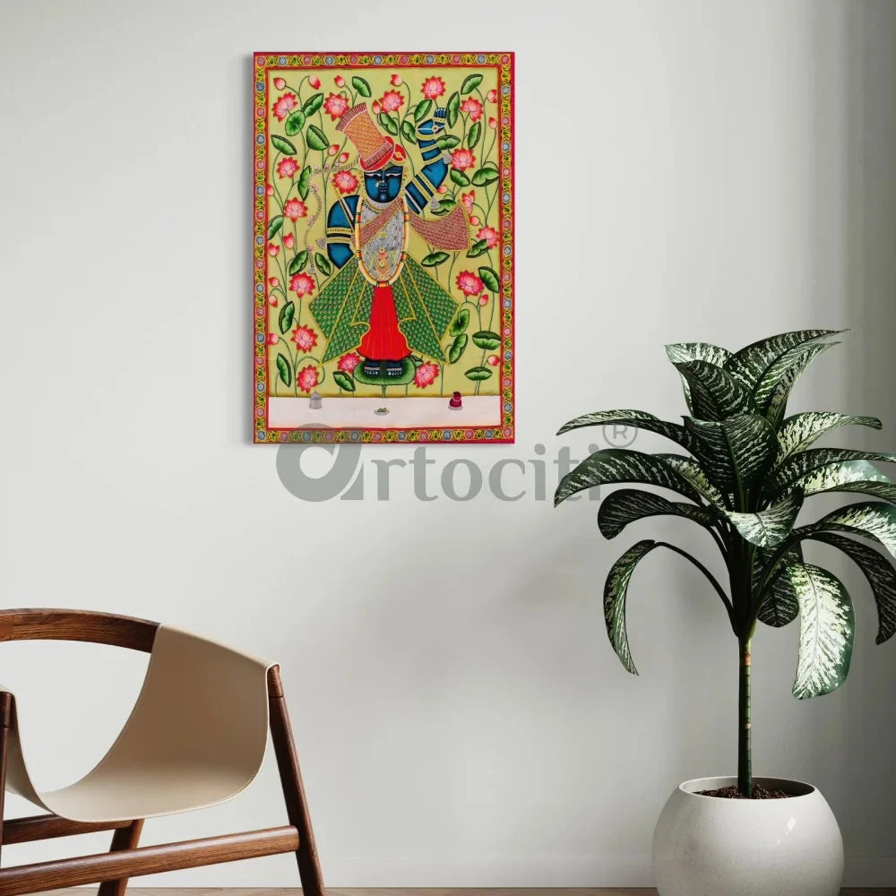 Immerse your surroundings in the divine aura of Lord Shreenath Ji with our exquisite Pichwai Canvas Giclee Print. Crafted in traditional artistry, this masterpiece is available in two sizes – 24X16 inches and 30×20 inches, ensuring a perfect fit for any space. Printed on high-quality 380 GSM canvas, the vibrant colors and intricate details come to life, capturing the essence of spiritual grace. Bring home the blessings and serenity of Lord Shreenath Ji with this timeless piece. Elevate your decor and create a sacred ambiance with this authentic and beautifully crafted canvas print.