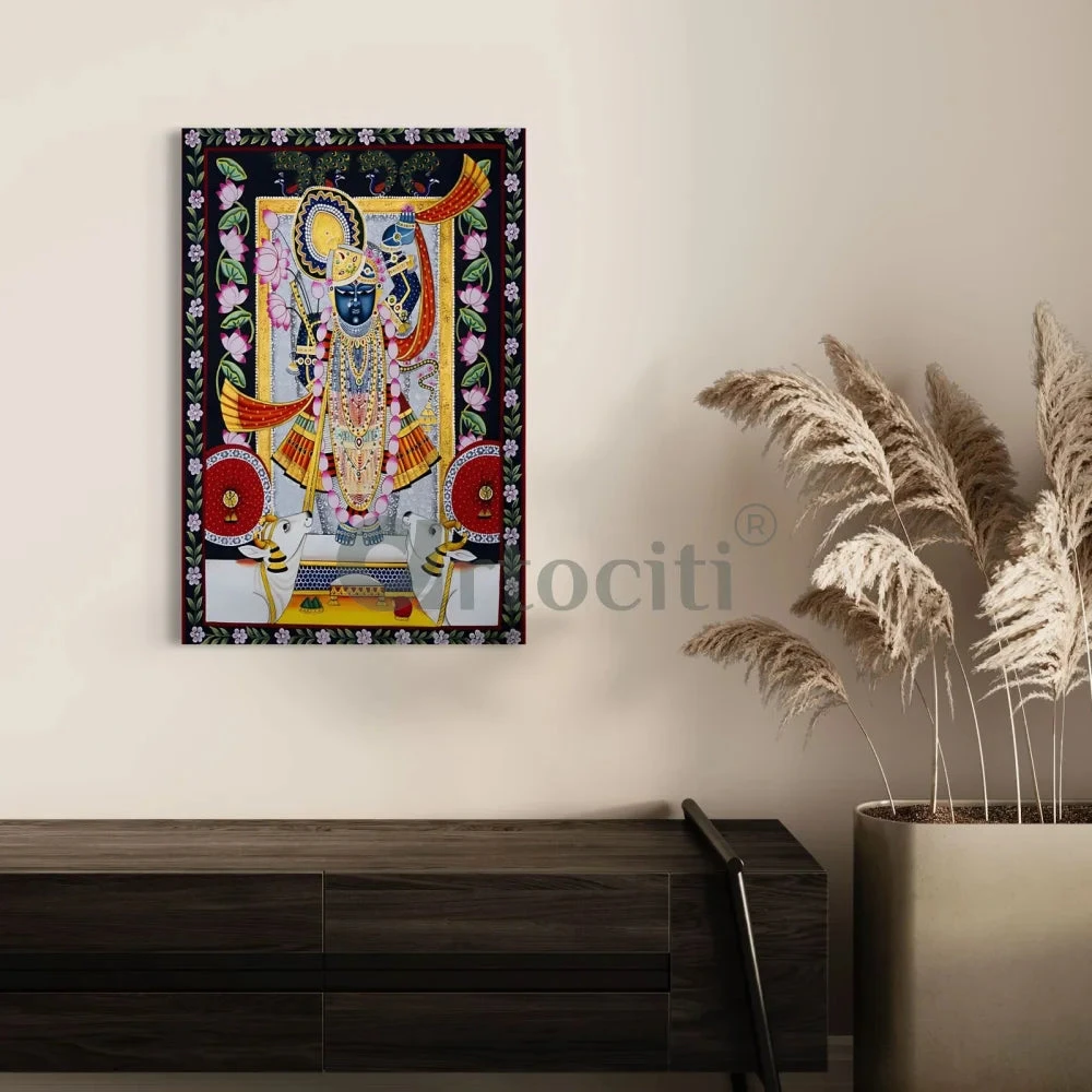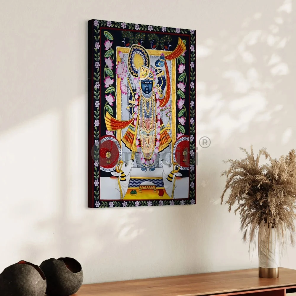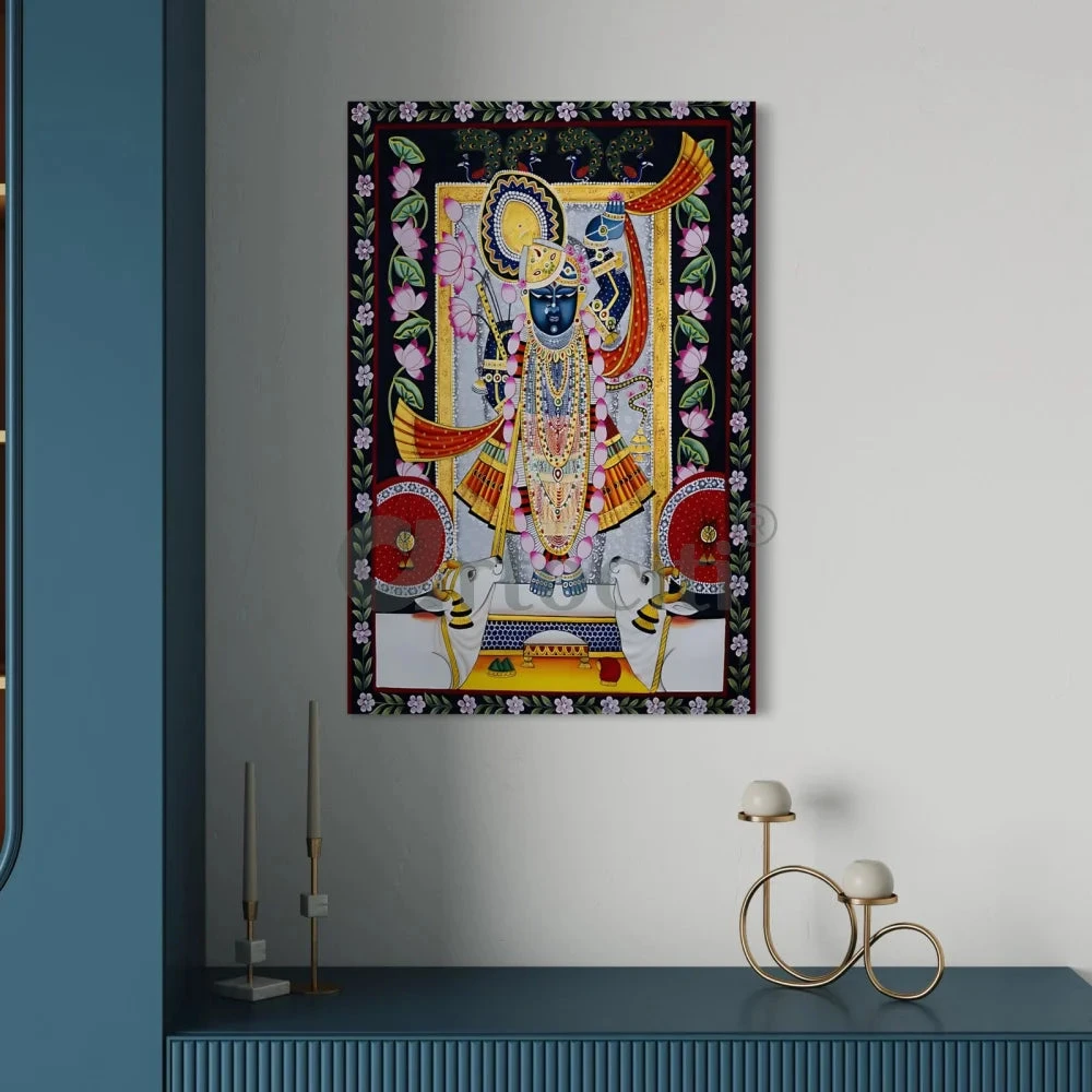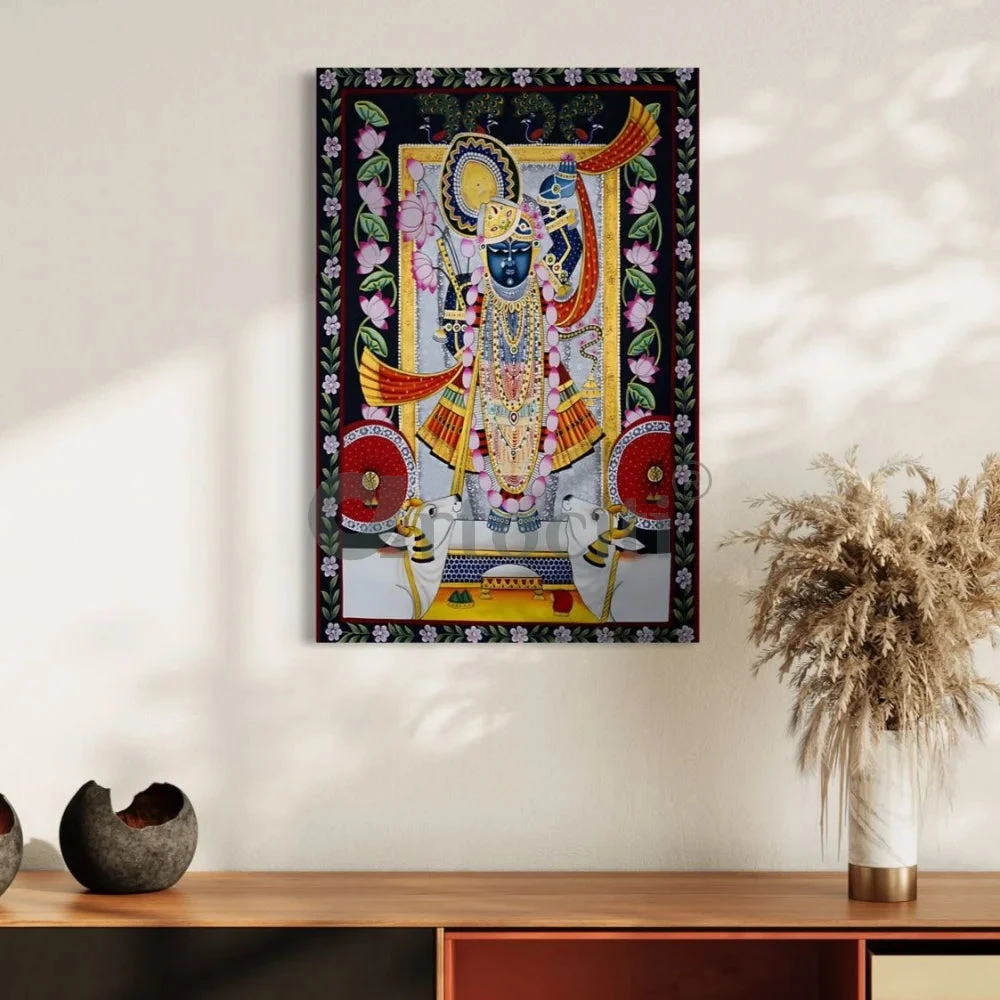 Immerse your surroundings in spiritual beauty with our Shreenath Ji Pichwai Lotus Design Canvas Giclee Print. Available in two sizes, 24×16 inches and 30×20 inches, this masterpiece showcases intricate details and vibrant colors. Printed on high-quality 380 GSM canvas, it exudes durability and brilliance. Bring the divine into your home or office, creating an ambiance of serenity and grace. Our prints are crafted with precision, ensuring an exquisite representation of the original artwork. Elevate your decor with the timeless allure of Shreenath Ji Pichwai Lotus, a symbol of divine energy and aesthetic sophistication.