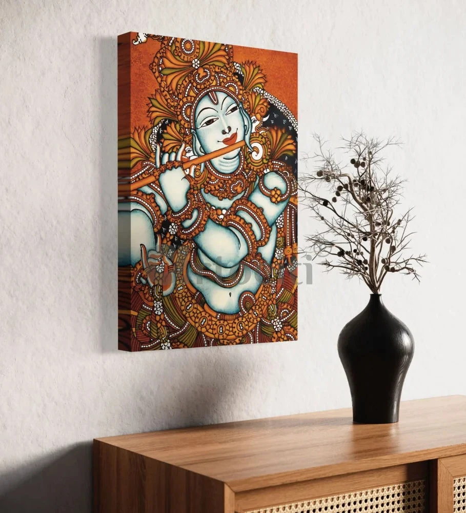 Elevate your space with our Kerala mural masterpiece – Lord Krishna playing his flute. This captivating canvas radiates the essence of devotion and music. Expertly printed on premium 380 GSM polycotton canvas, available in 24X16 and 30X20 inches. Each piece is thoughtfully mounted on wooden frames, ensuring a gallery wrap quality, adding a touch of divine charm to your surroundings.